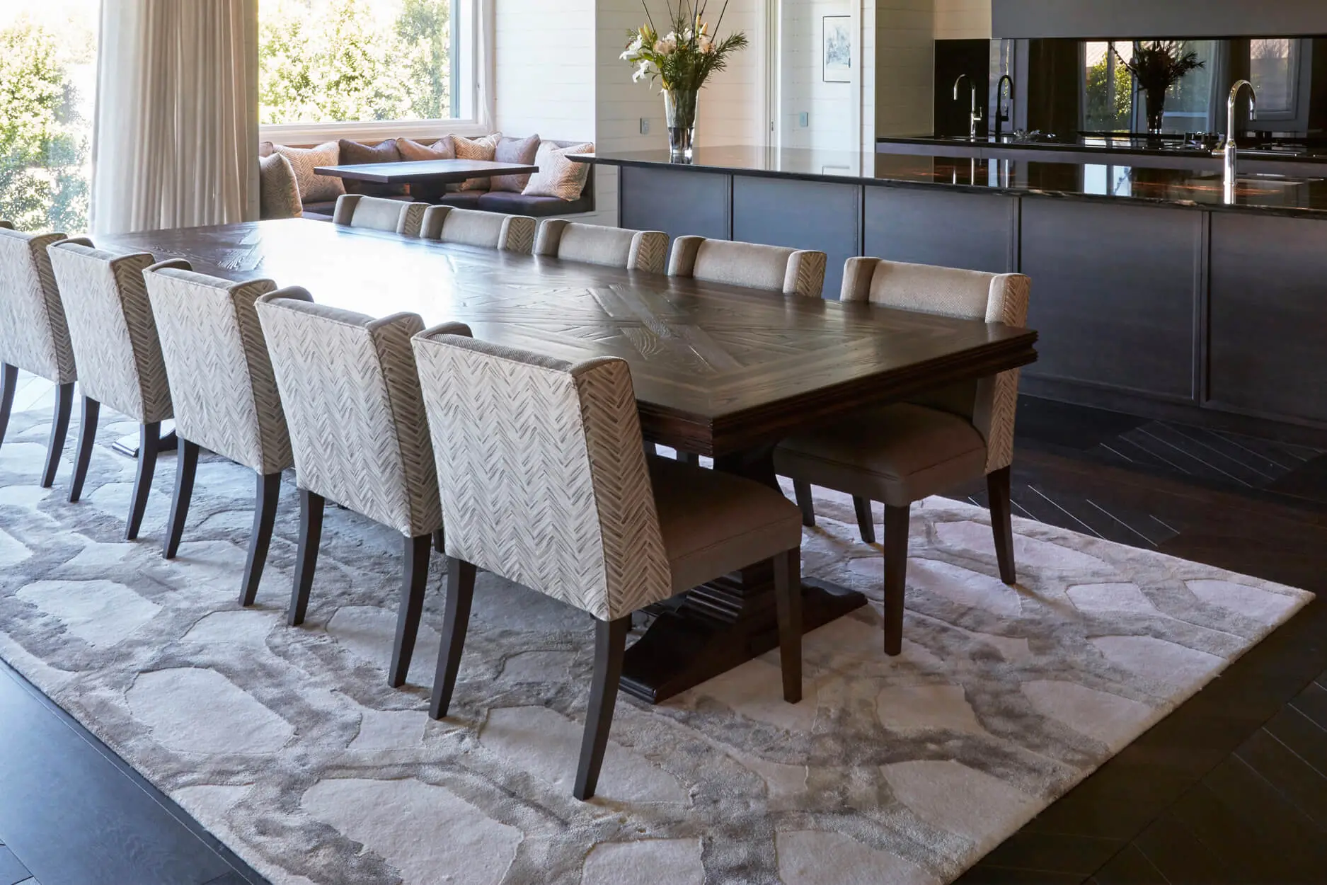 Custom designed and made, this bespoke dining room floor rug is crafted to premium quality using luxurious pure NZ wool, textured yarns, and highlights.