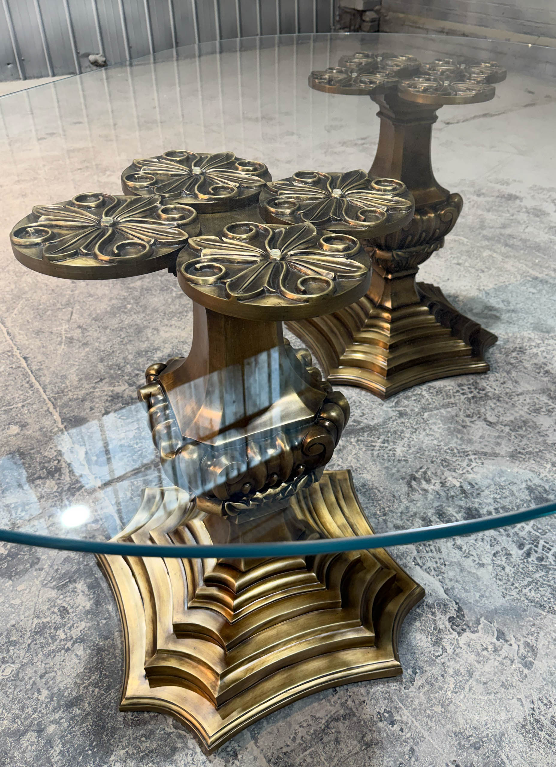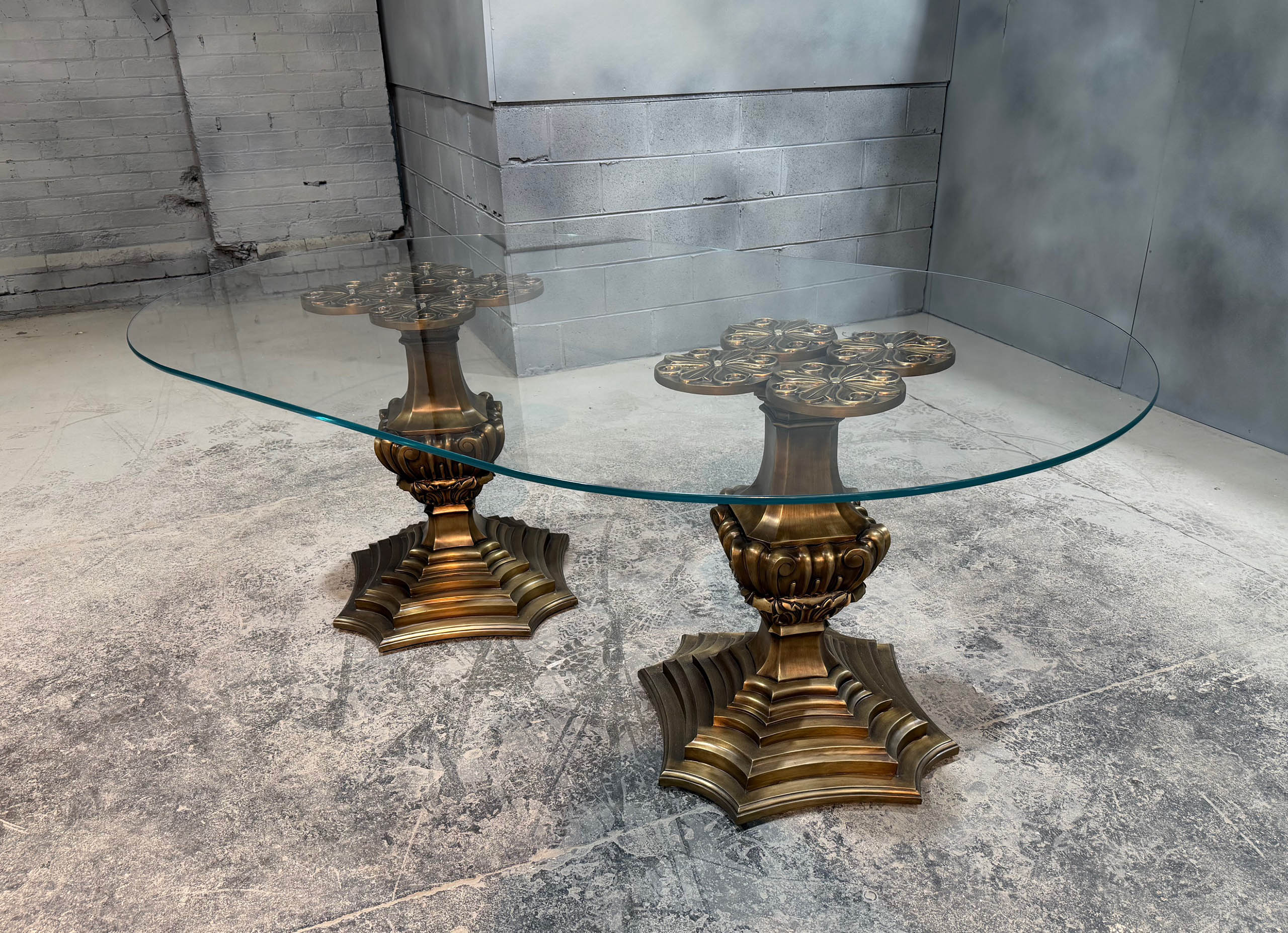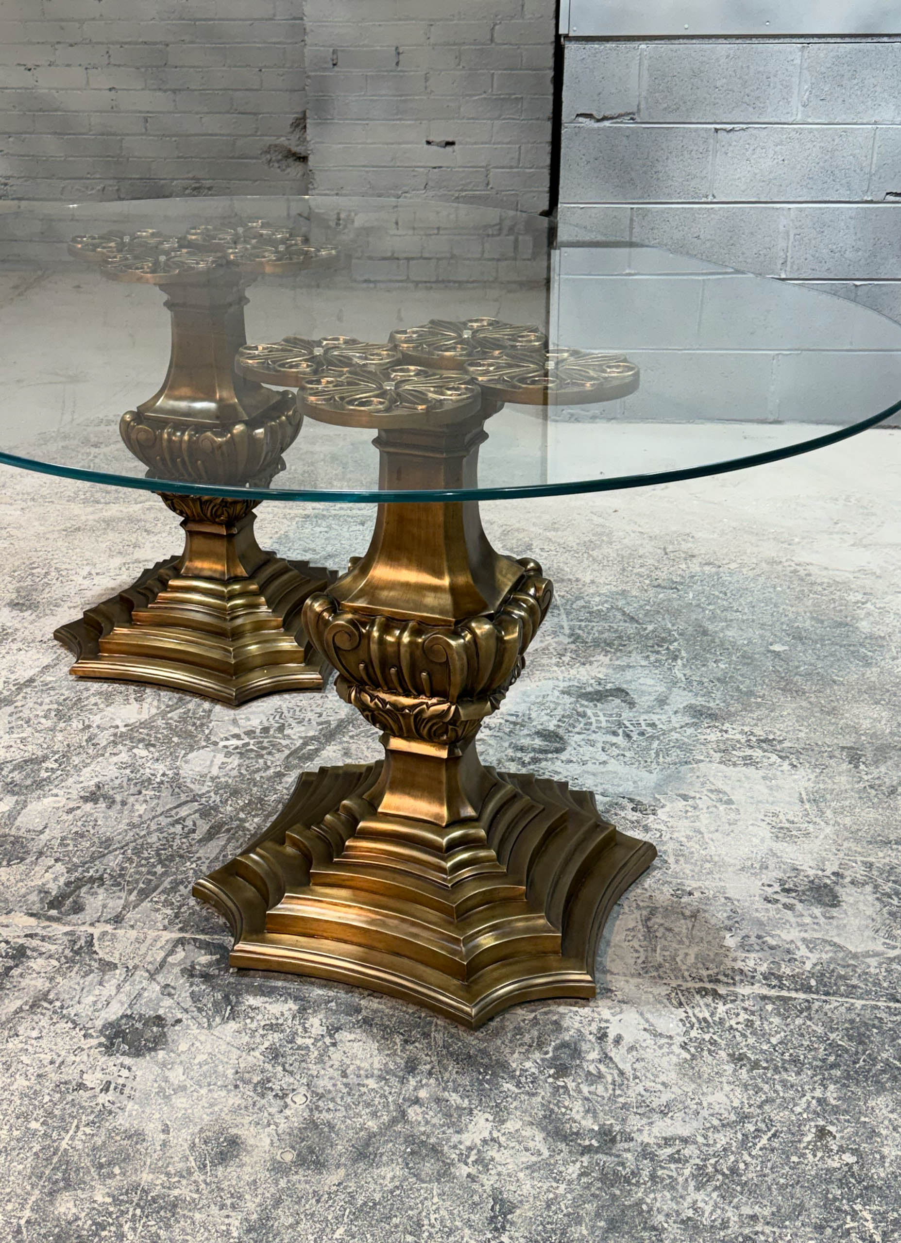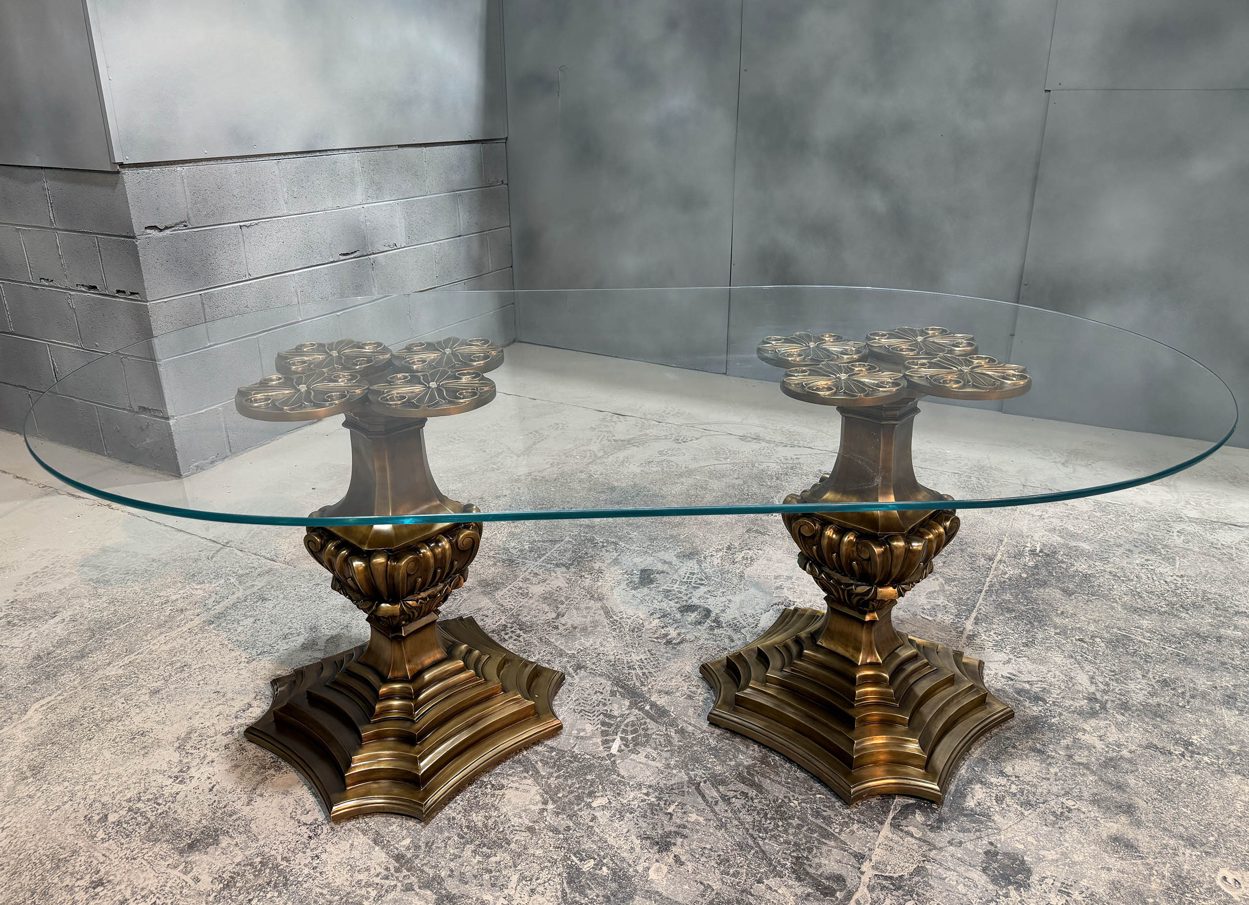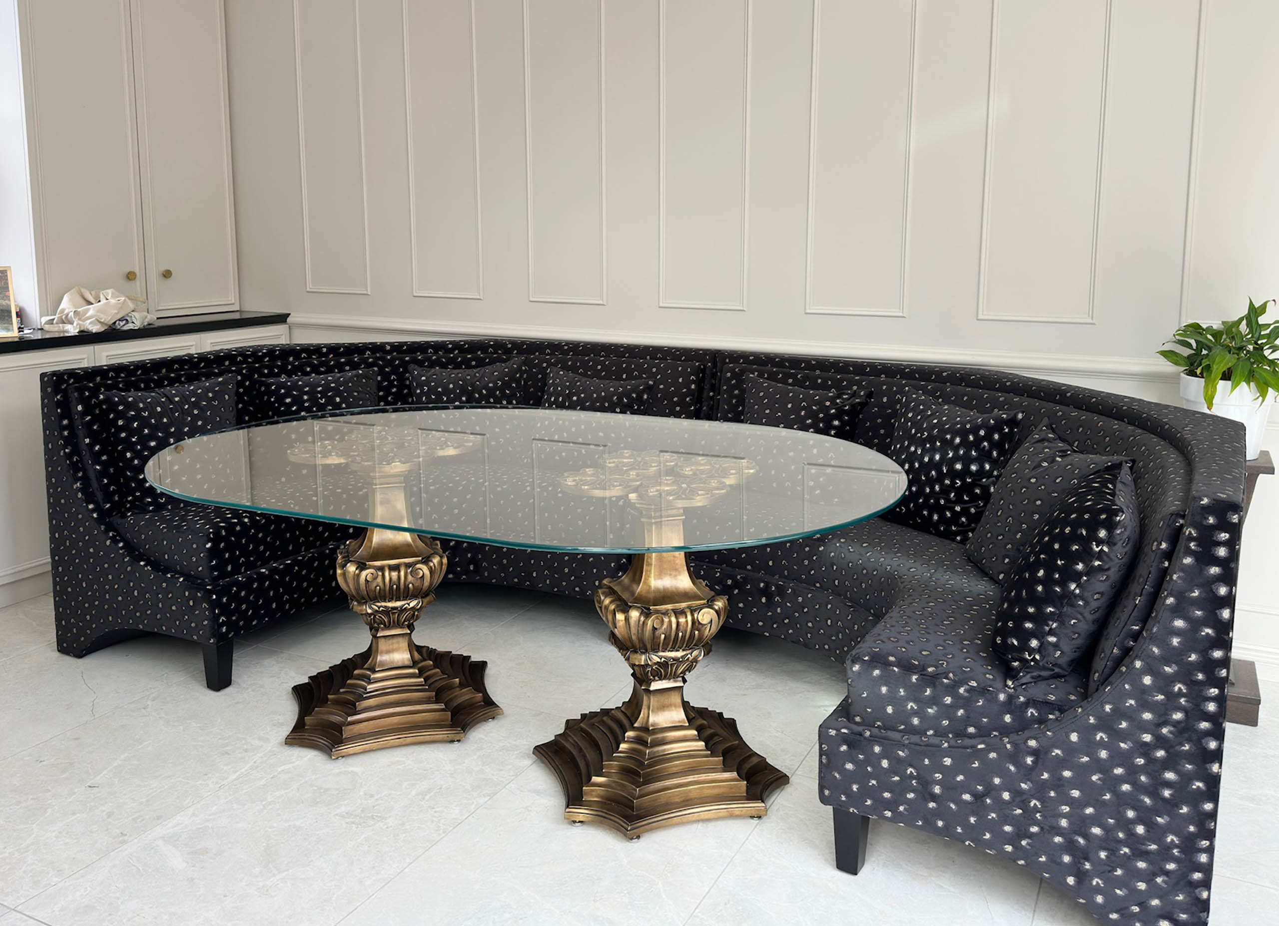 The bespoke French banquette table is custom made with a double carved bronze base and an oval glass top. Crafted by luxury interior designer and furniture manufacturer Mark Alexander, it combines elegant French detailing with bespoke craftsmanship.