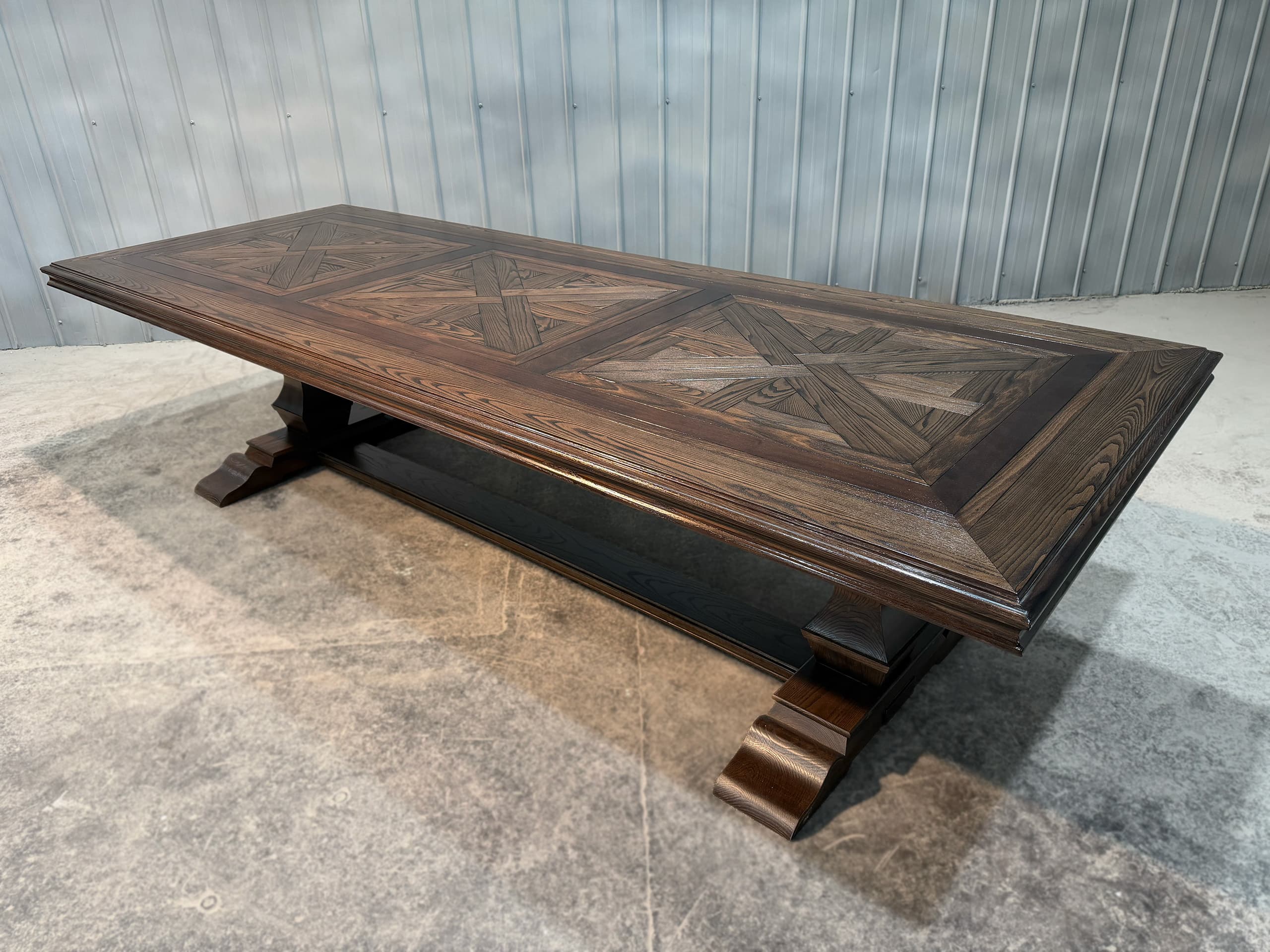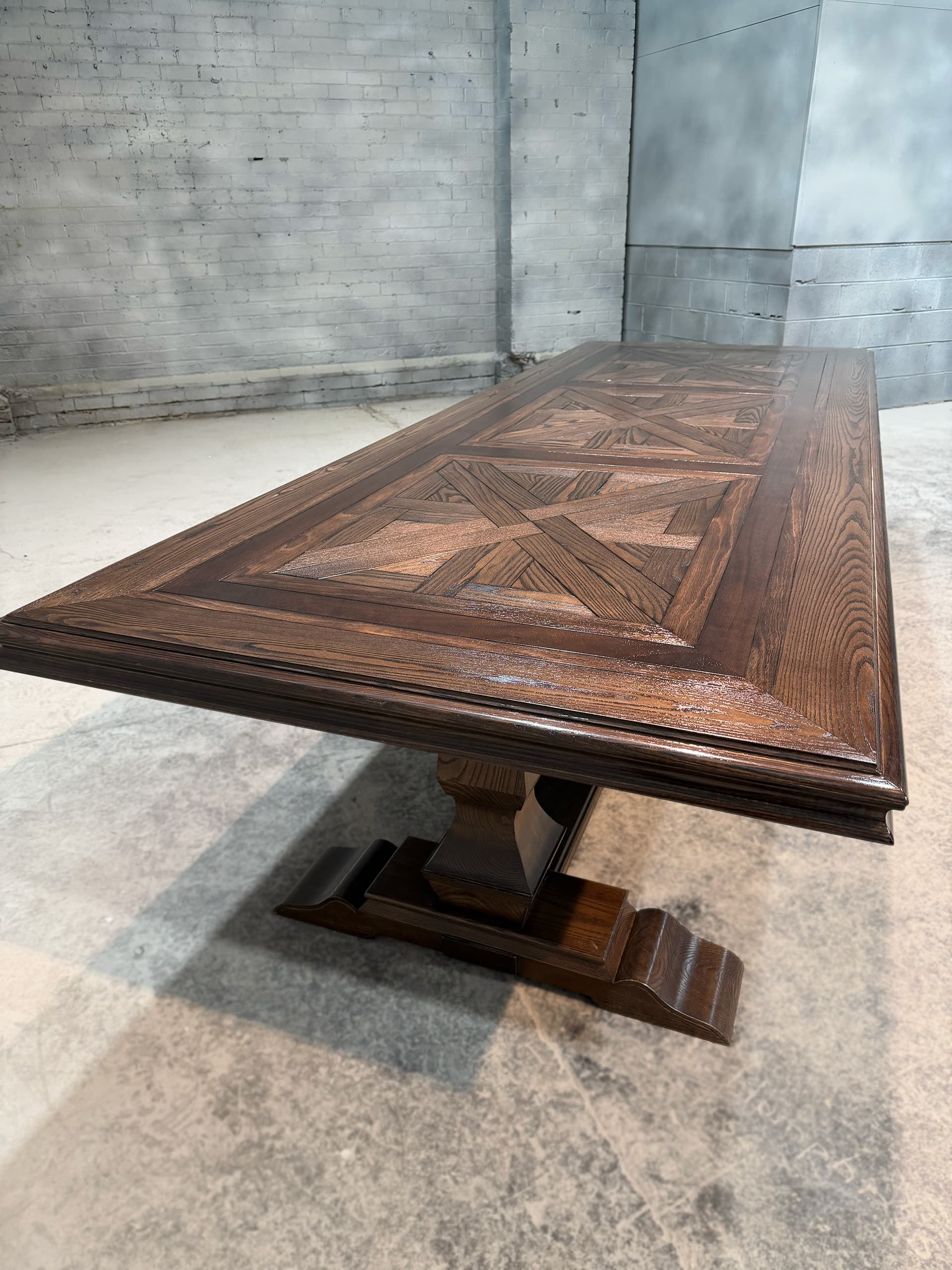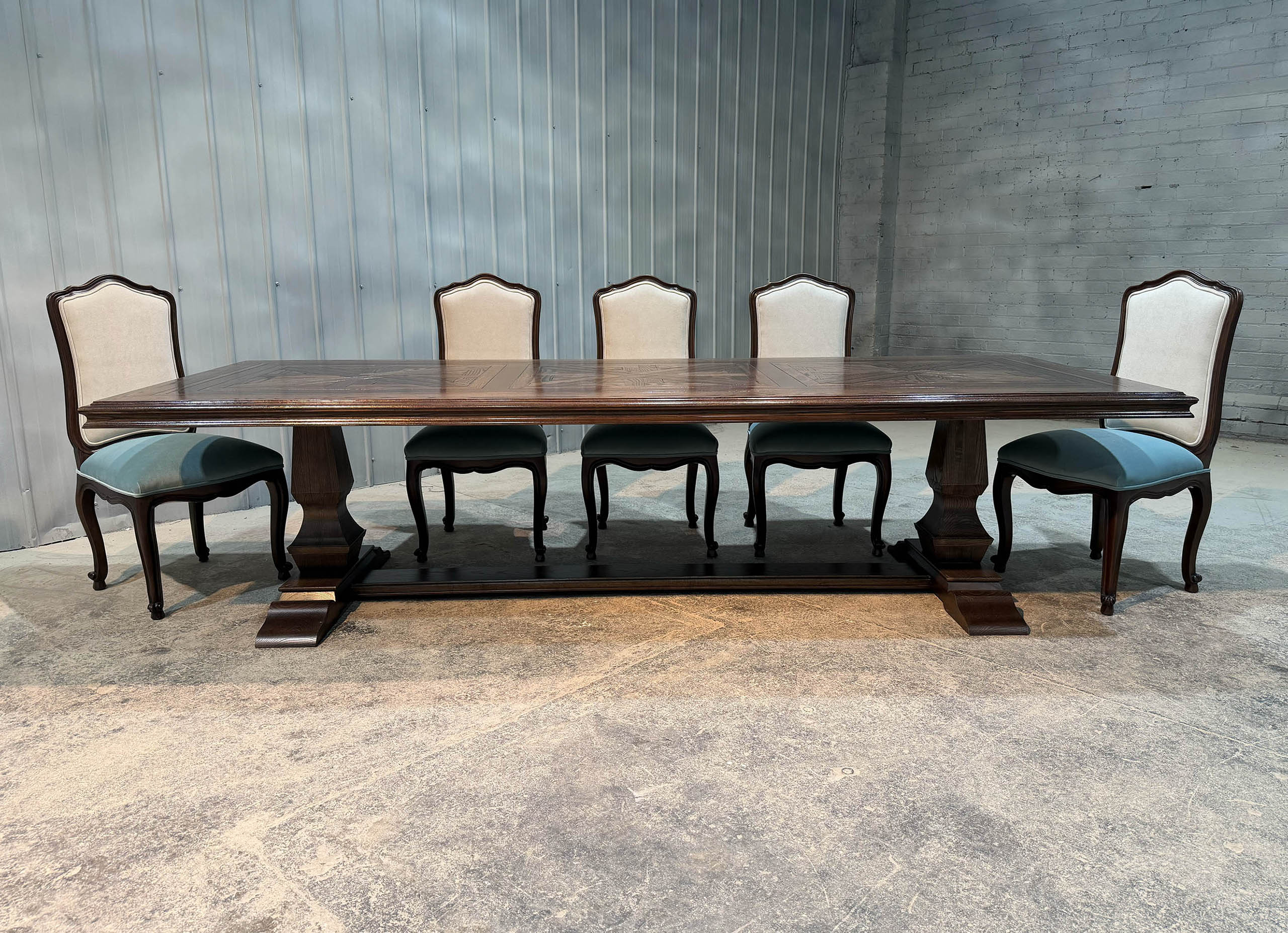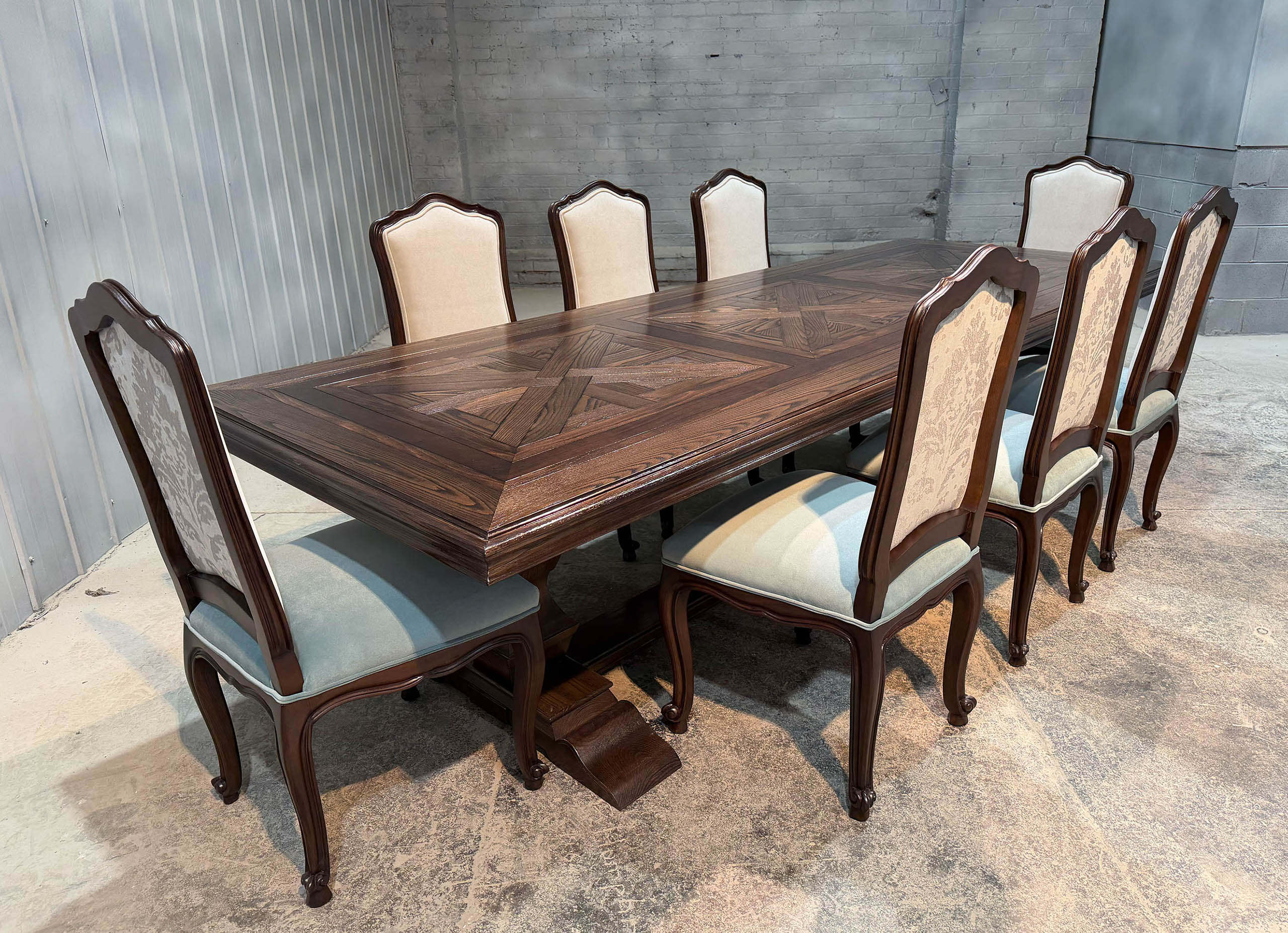This bespoke French parquetry dining table is a statement piece for a refined French Provincial Hamptons interior, showcasing the artistry and precision of handcrafted luxury furniture. Constructed from solid oak timber, the dining table features intricate parquetry inlay details across the tabletop boards, creating visual depth and sophistication.This parquetry dining table has been crafted to complement the living room setting, with smooth, clean finishes, ensuring a polished elegance.