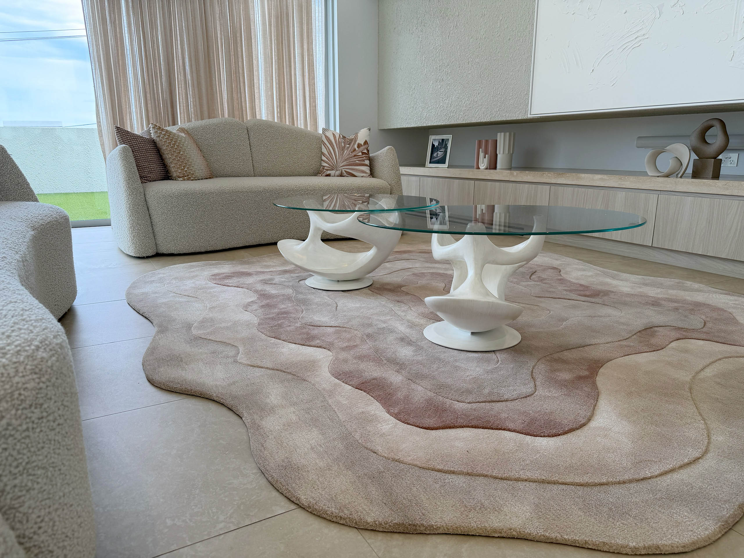 The bespoke living room floor rug is custom made to complement the existing sofa layout, featuring an organic, irregular silhouette that echoes natural contours and adds a soft, sculptural flow to the Mid Century living space. The custom shape visually anchors the seating area while enhancing the room’s overall balance, handcrafted by luxury interior designer and furniture manufacturer Mark Alexander.