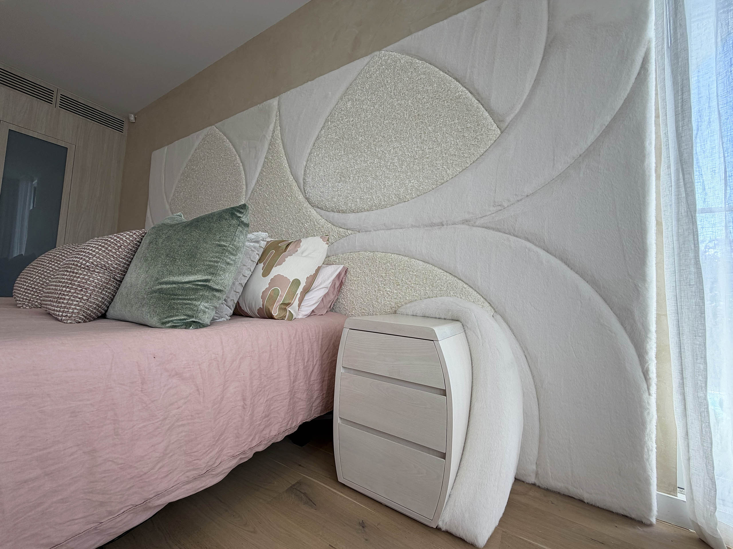 The bespoke Mid Century sculptural bedside table is custom made from solid oak and oak veneer, featuring linear details on the drawer fronts with hidden hand pulls. The front showcases a contrasting bedhead-inspired design, complemented by matching fabric panels on the sides, handcrafted by luxury interior designer and furniture manufacturer Mark Alexander.