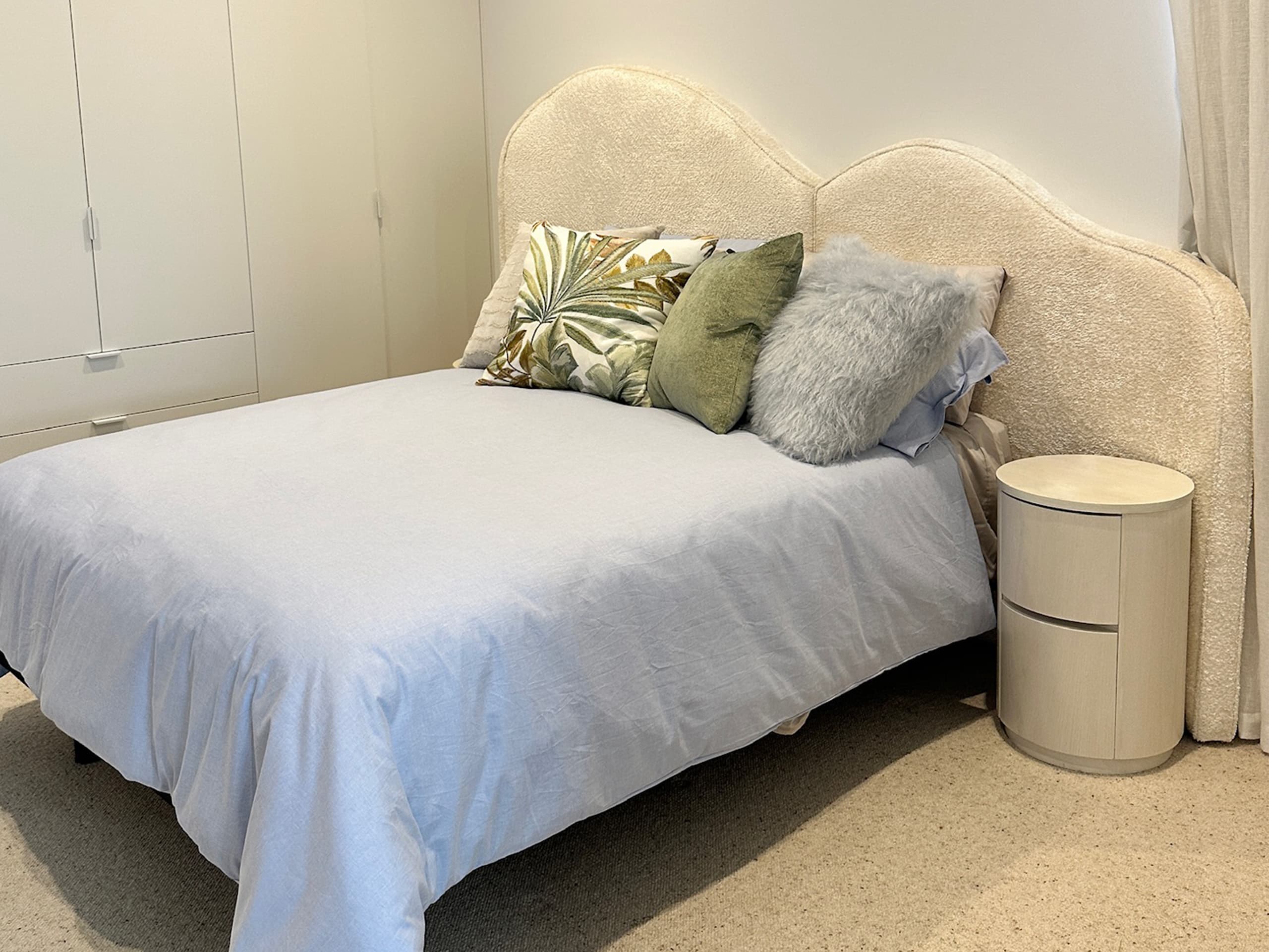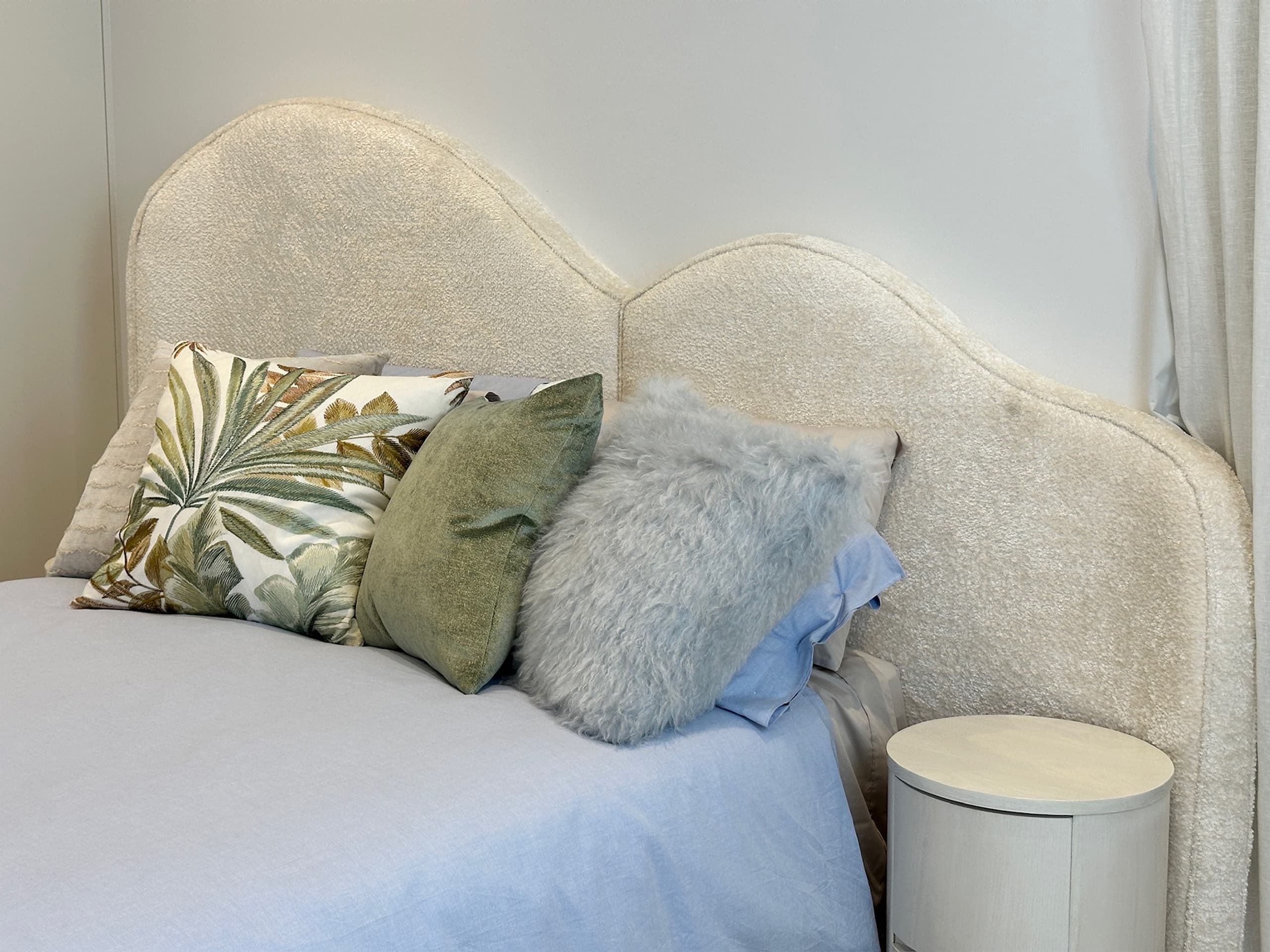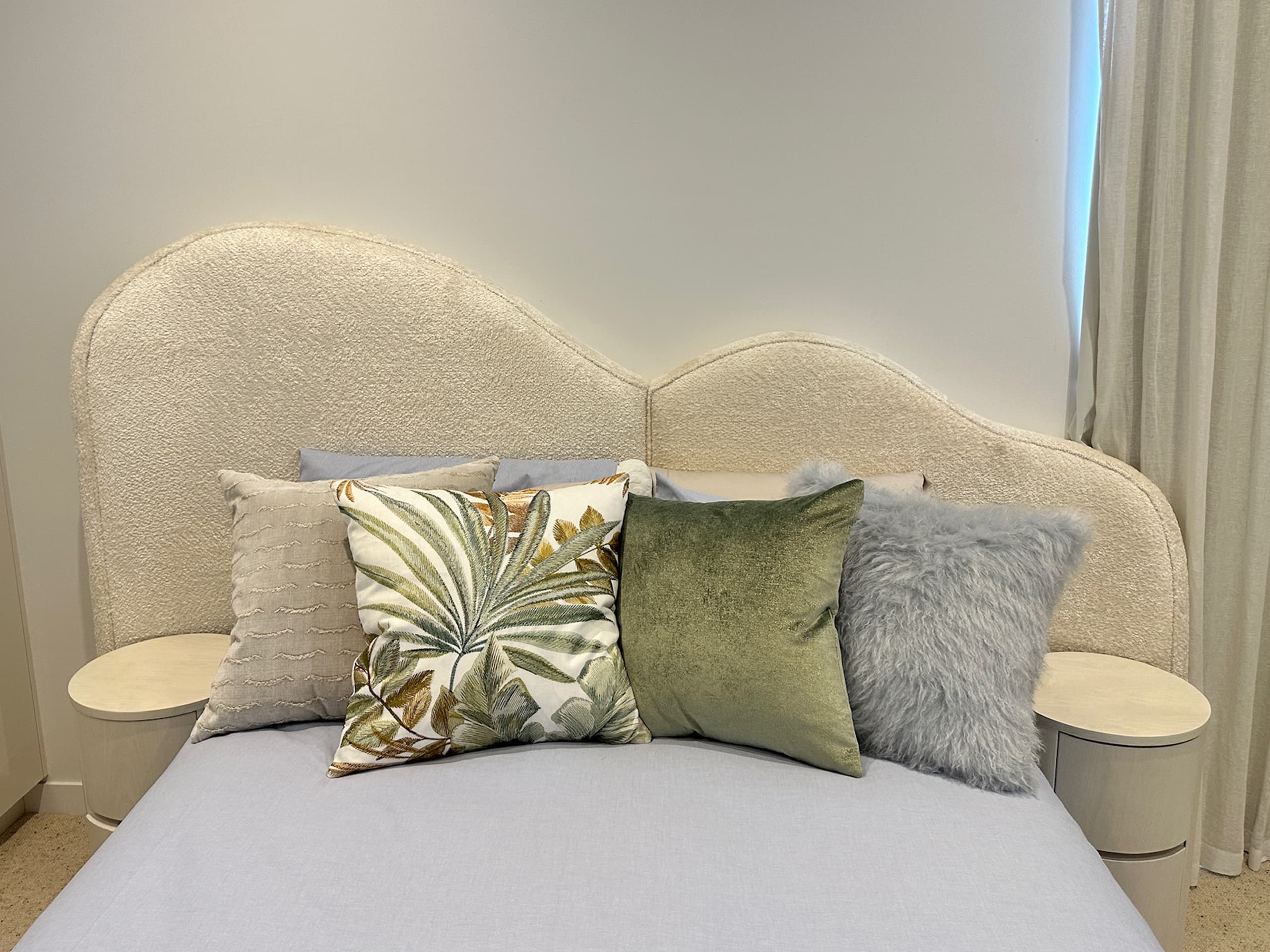 This custom made bed head is a sophisticated addition to any modern contemporary interior, combining gentle curvature with luxurious upholstery for a statement of elegance and comfort. Featuring luxurious fabric, it adds warmth and texture while maintaining a refined and contemporary presence in the bedroom.