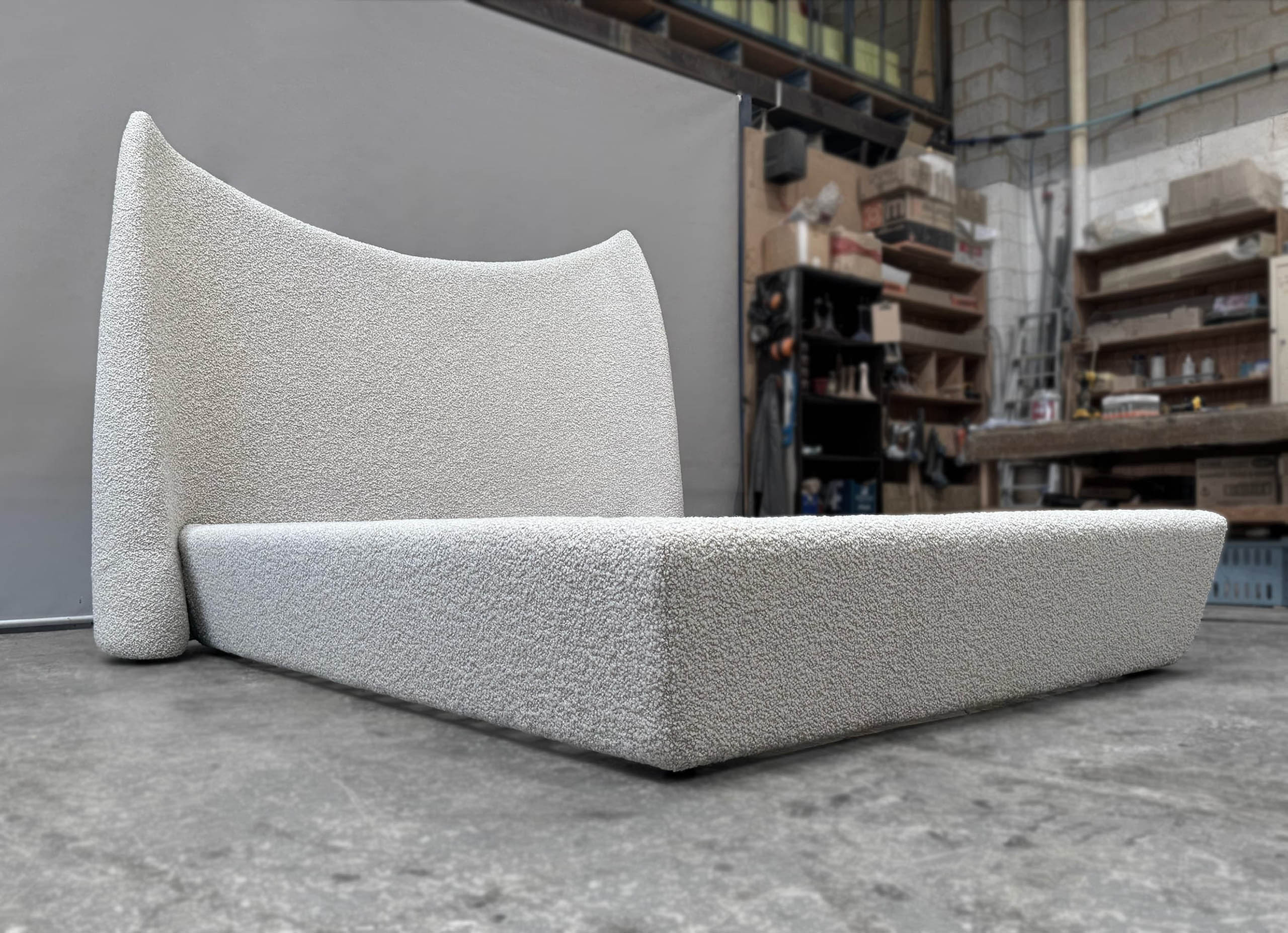 The bespoke queen size bedhead and base are custom made to harmonise with the sofa and the home’s architecture. Designed with a Mid Century aesthetic in mind, they provide both comfort and sculptural elegance, handcrafted by luxury interior designer and furniture manufacturer Mark Alexander.