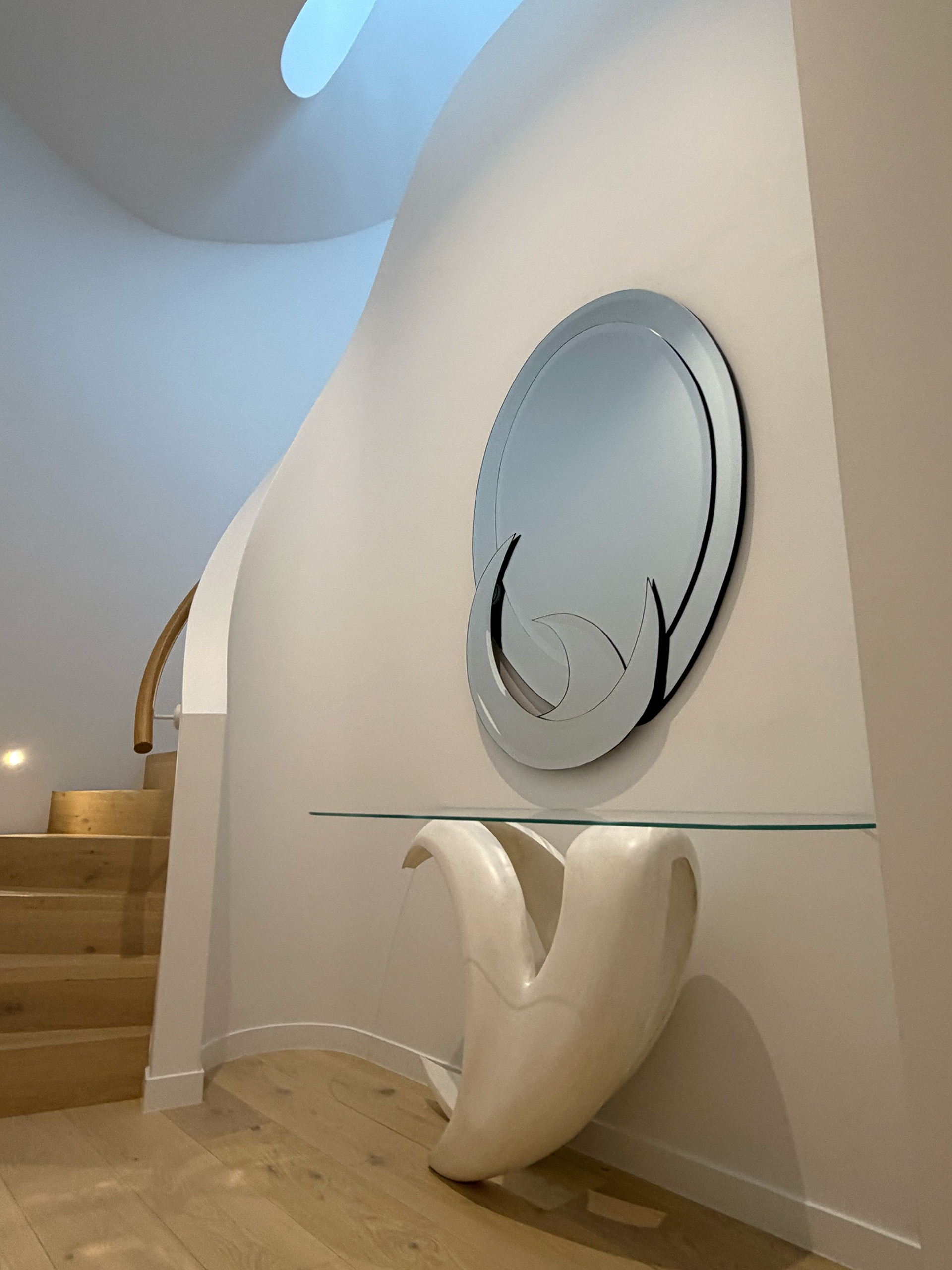 The bespoke Mid Century sculptural mirror is custom made to echo the console table’s sculptural style, designed specifically for the basement entryway. Featuring a refined circular form with a 20mm bevelled edge, it combines modern functionality with sculptural elegance, handcrafted by luxury interior designer and furniture manufacturer Mark Alexander.