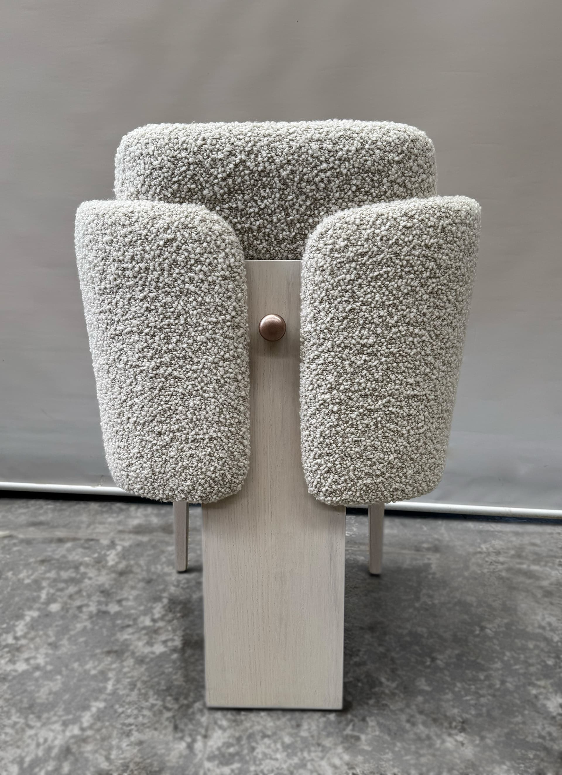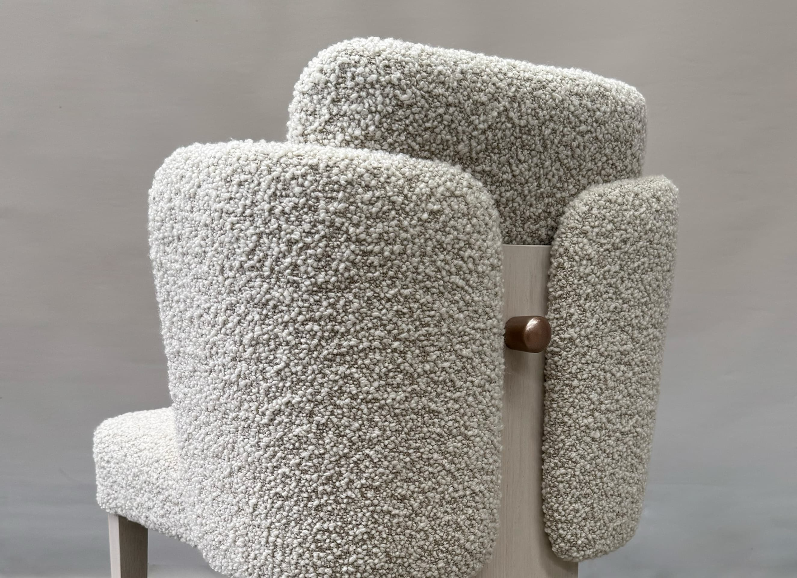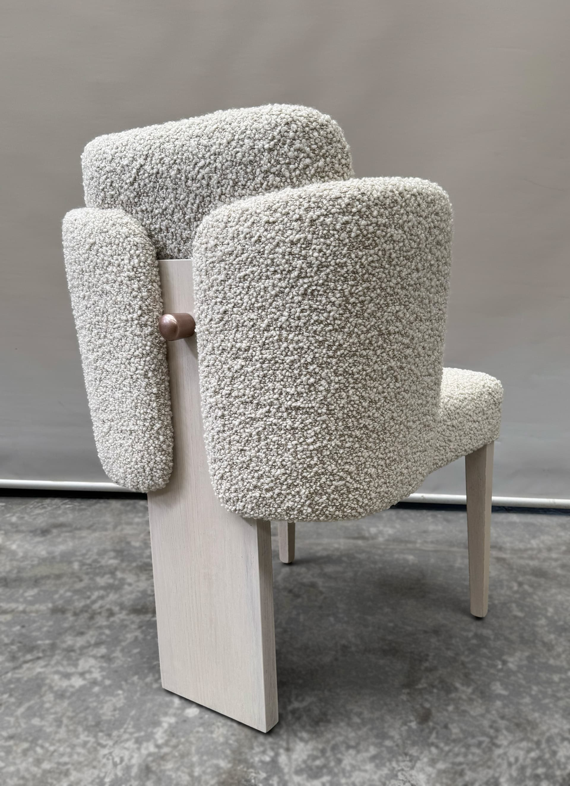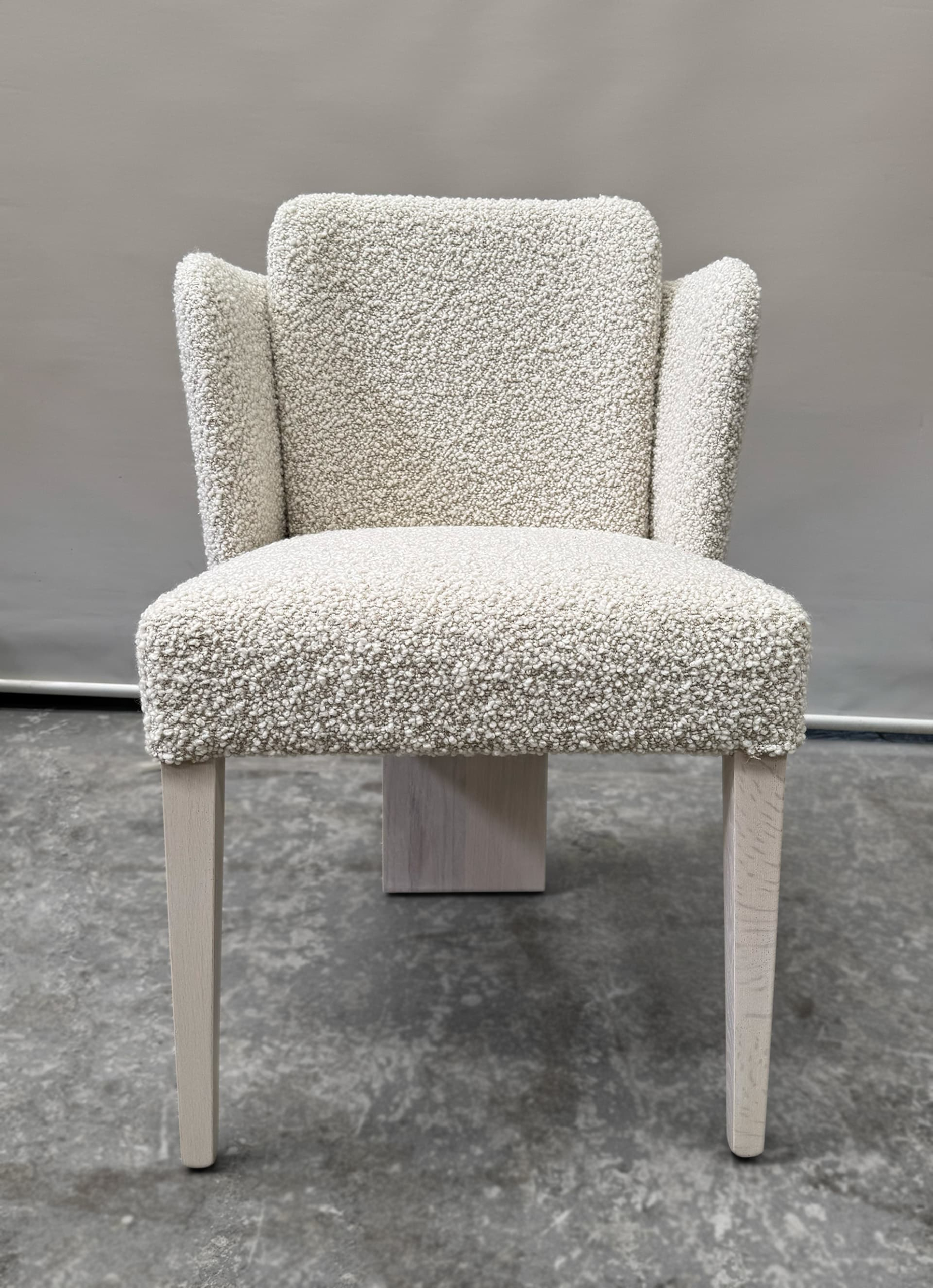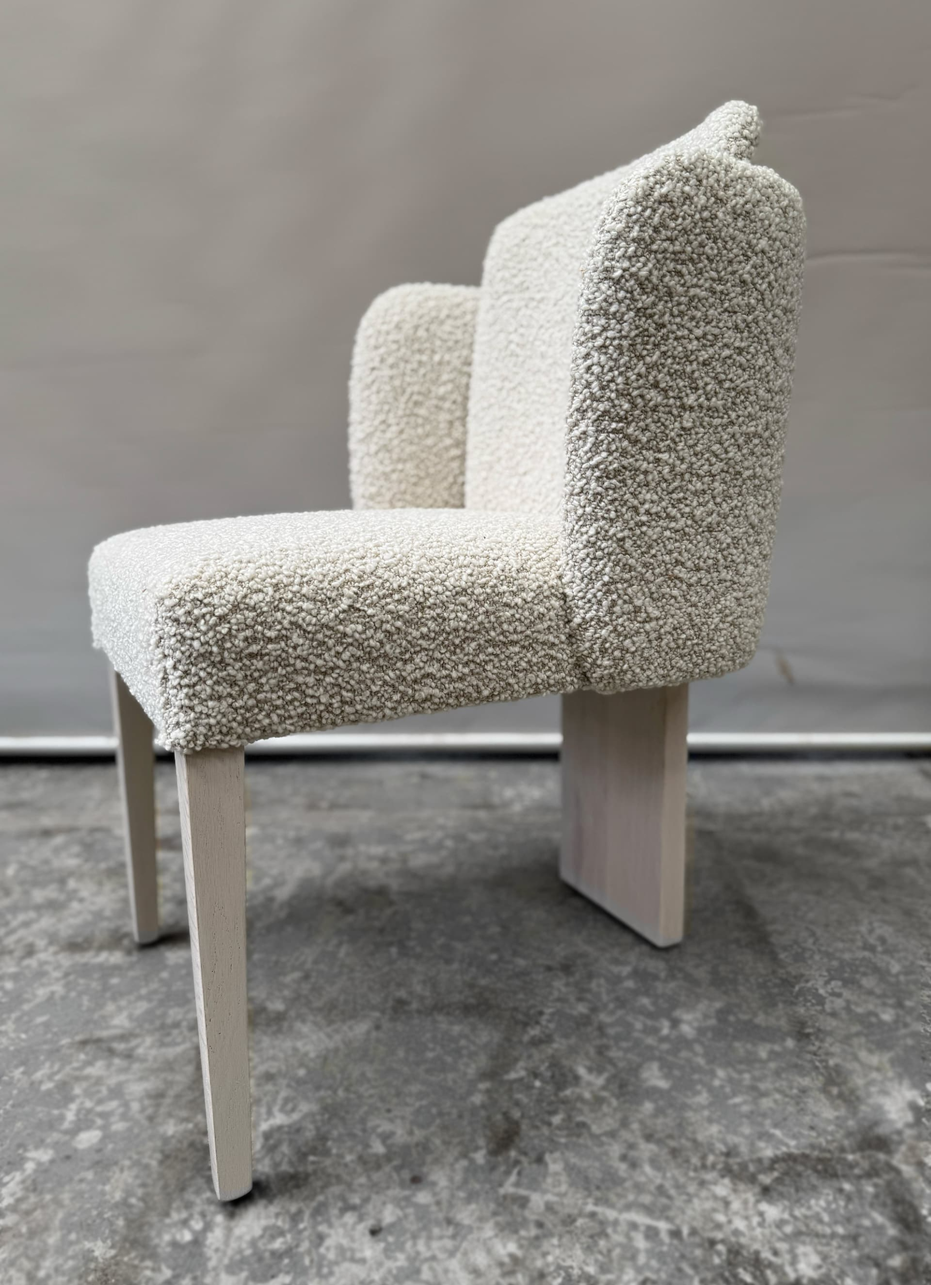 The custom made modern dining chair merges sculptural elegance with ergonomic function. Its enveloping backrest curves gently around the seat, providing excellent support and comfort while introducing a refined, contemporary silhouette. The frame is expertly handcrafted from high-quality solid wood for structural stability and lasting durability. Sleek, tapered legs feature subtle geometric elements, adding depth and sophistication, designed by luxury interior designer and furniture manufacturer Mark Alexander. Perfect for modern furniture and modern interiors.
