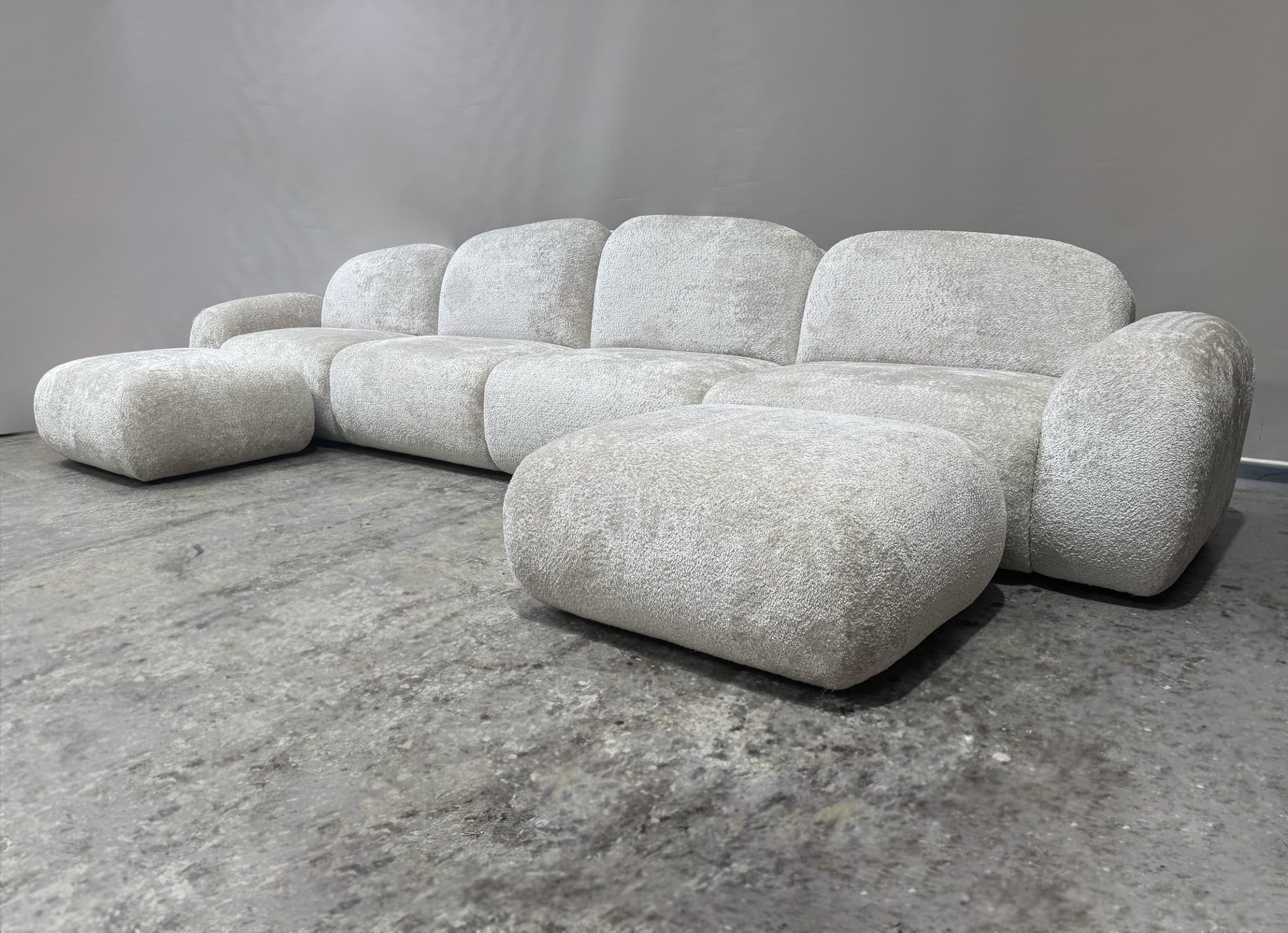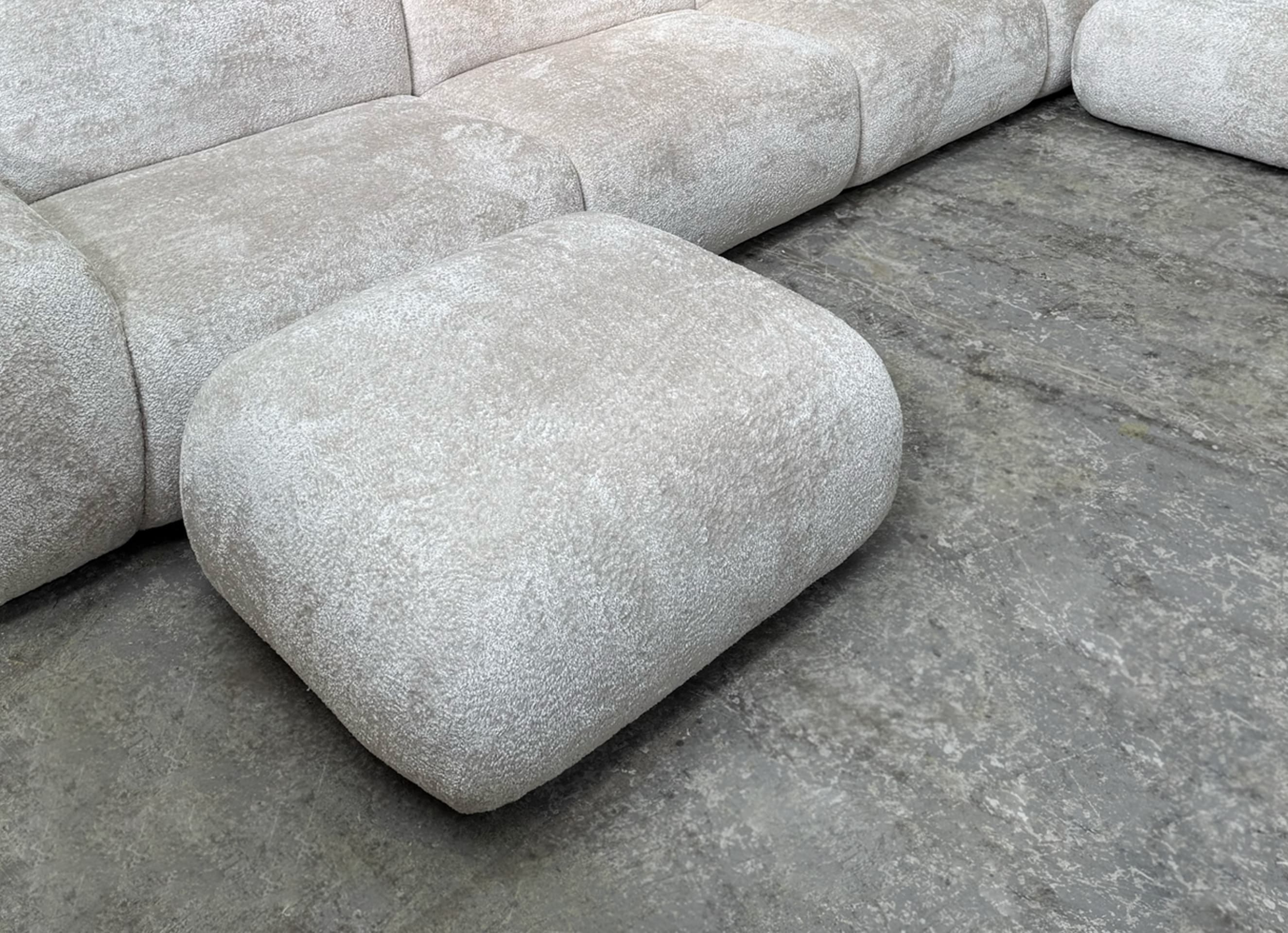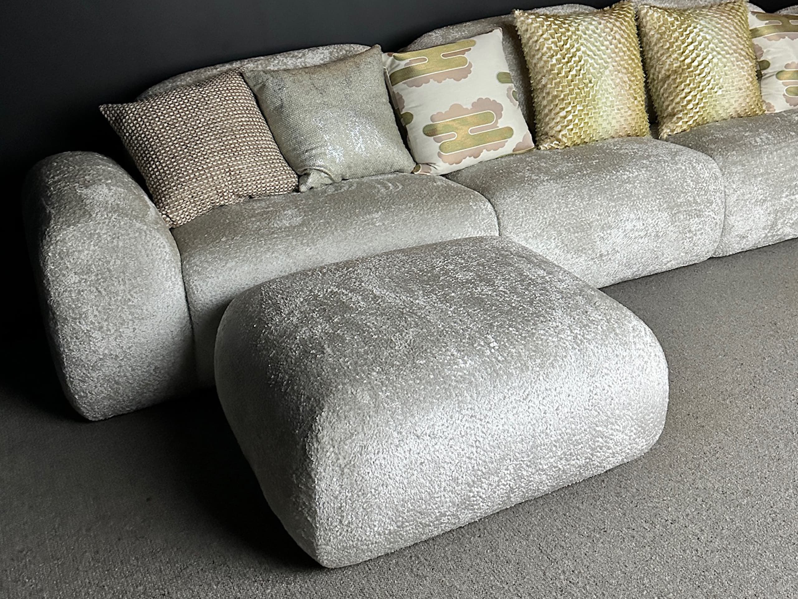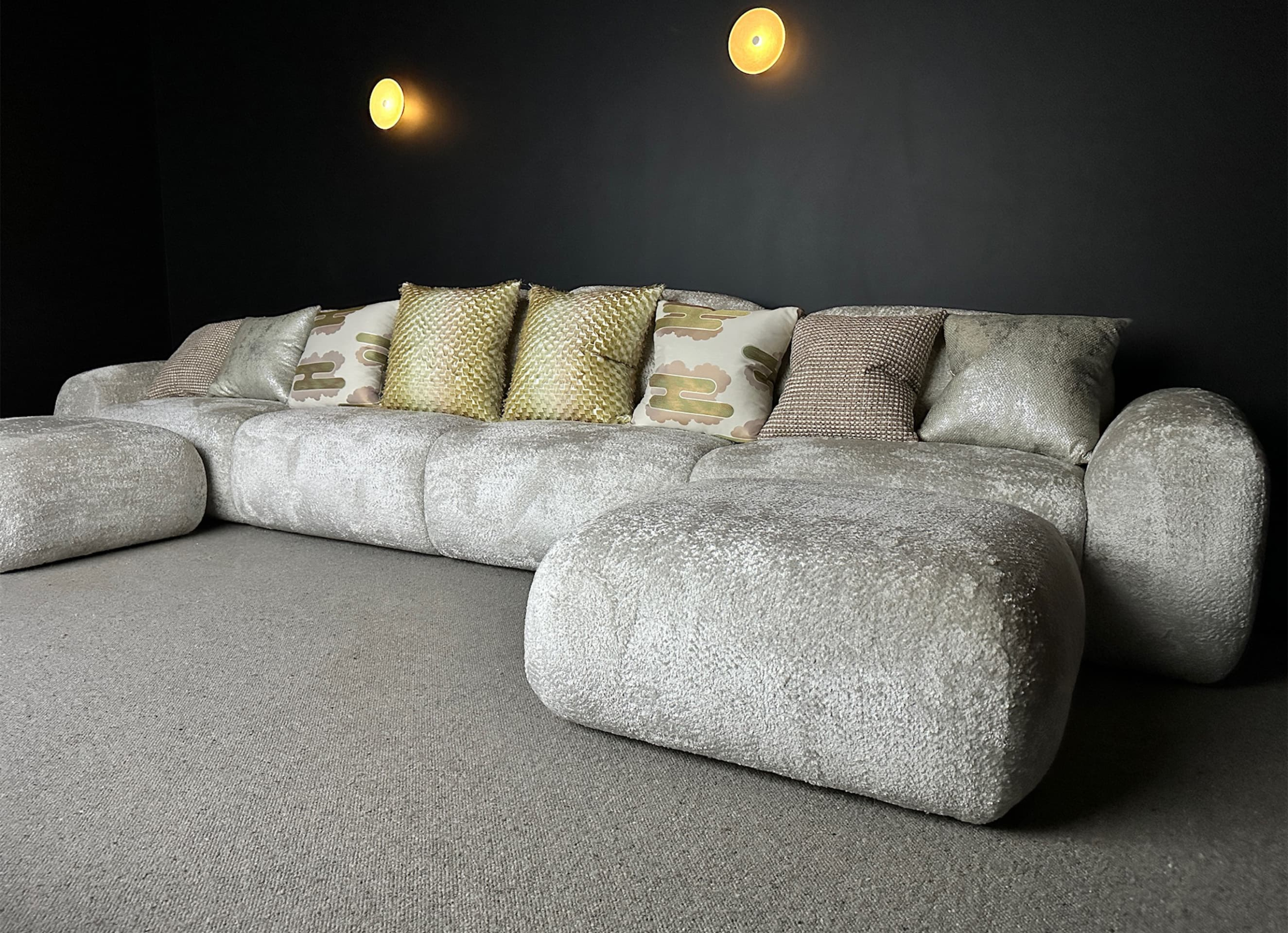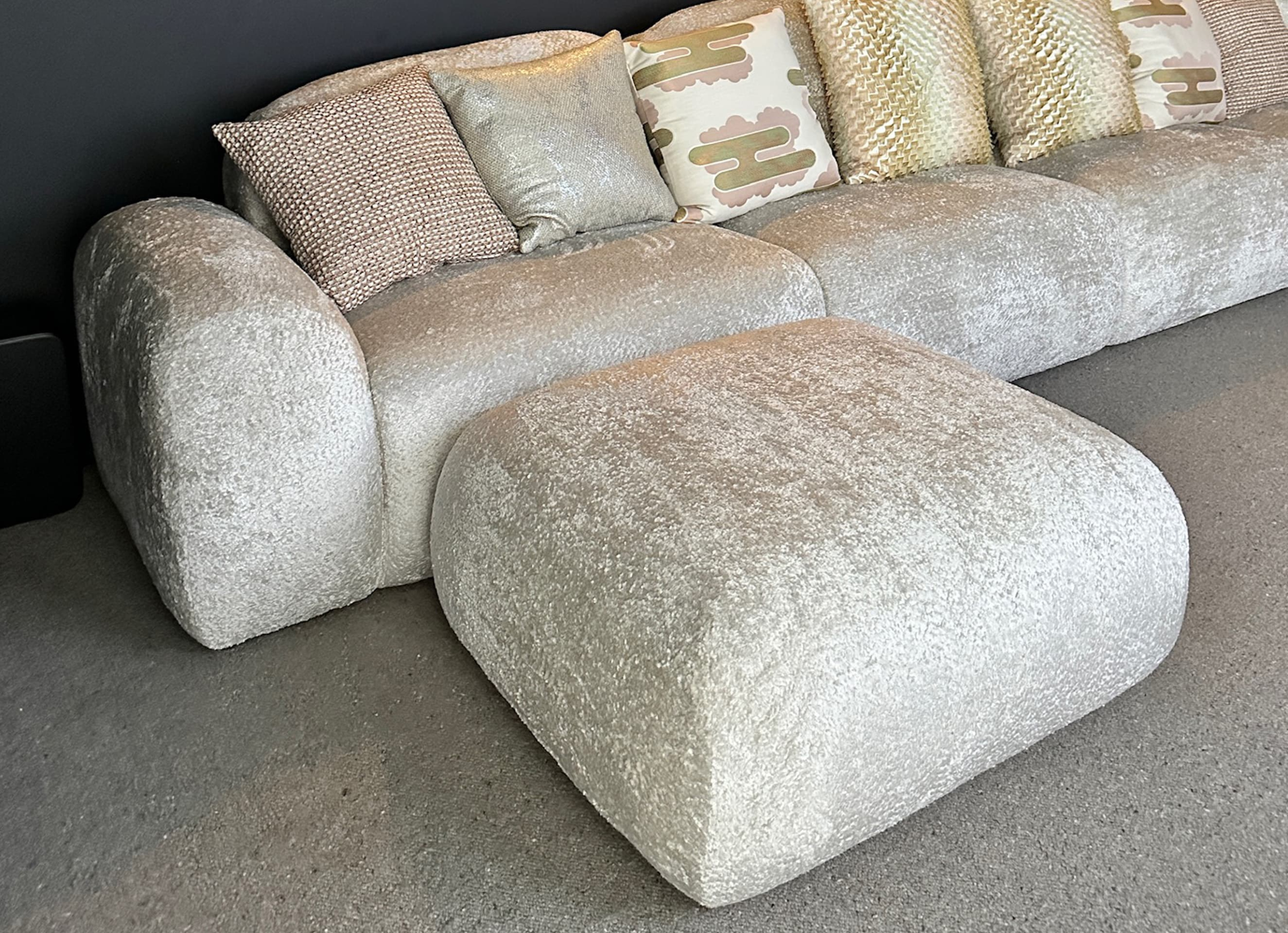 The custom made modern ottoman is designed to complement the home theatre lounge sofa, echoing its sculptural form and modern style. Handcrafted for comfort and visual harmony, it is made by luxury interior designer and furniture manufacturer Mark Alexander.