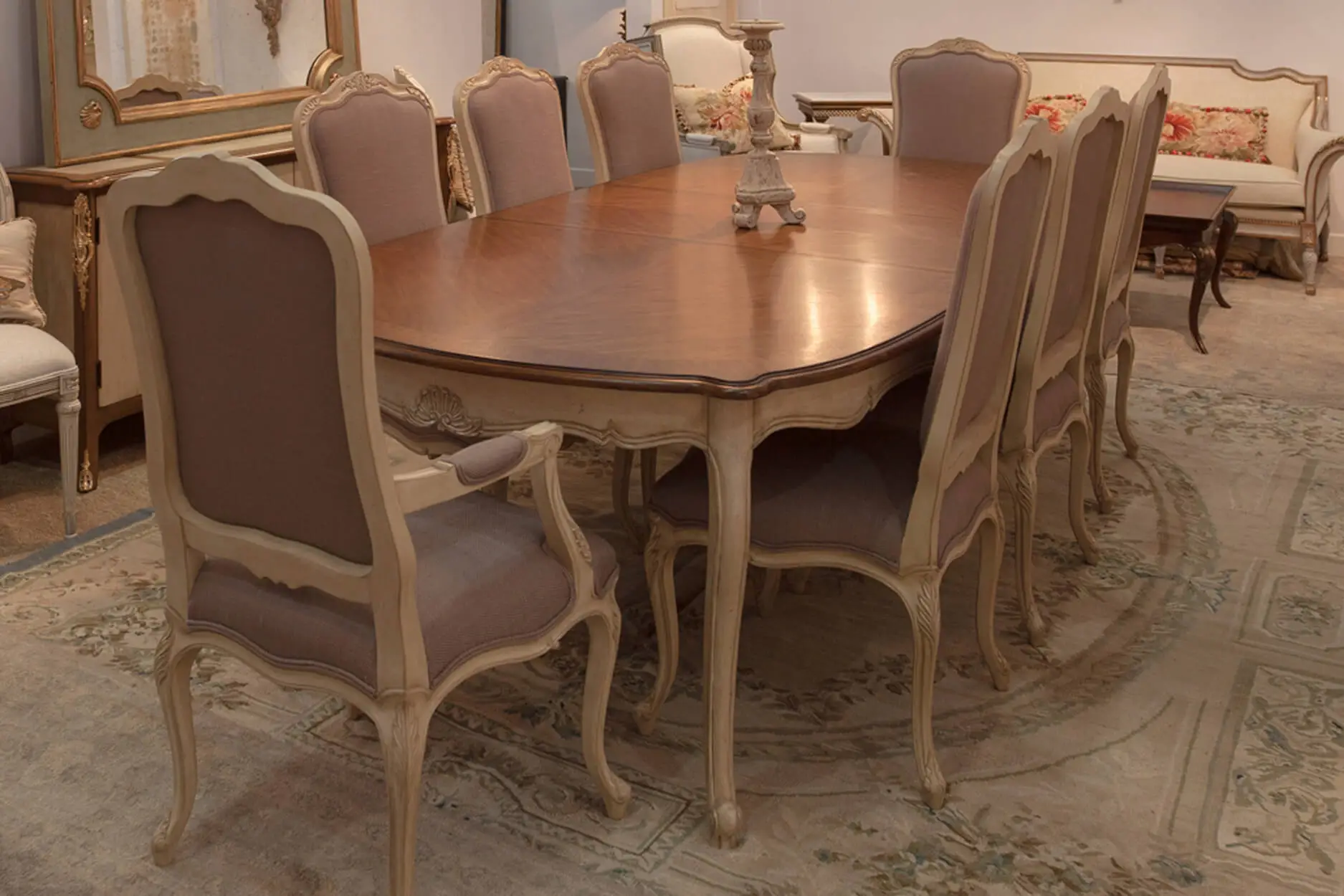 A French Louis XV extension dining table with a center extending leaf exemplifies the elegance of typical French style. This beautifully hand-crafted dining table features an elegant shape and finish. The polished tabletop showcases a refined French aesthetic with slightly stepped edges and rounded corners. Cabriole legs at the corners are decoratively detailed with intricate leaf carvings, adding to the table’s overall charm.