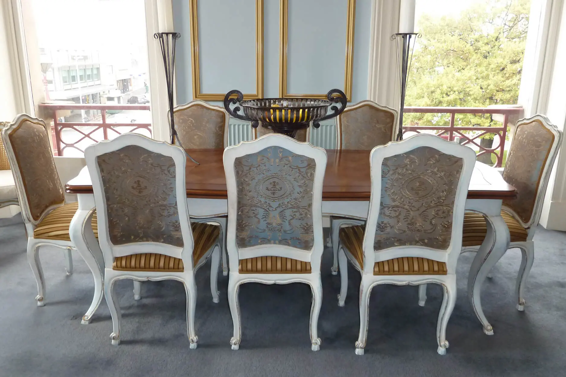 Classic French parquetry dining table with a bespoke design and finish. American cherry parquetry table top finished in a matt satin finish. Elegantly curved French style Cabriole legs finished in a contrast painted antique white with subtle blue highlights and gold gild trim.