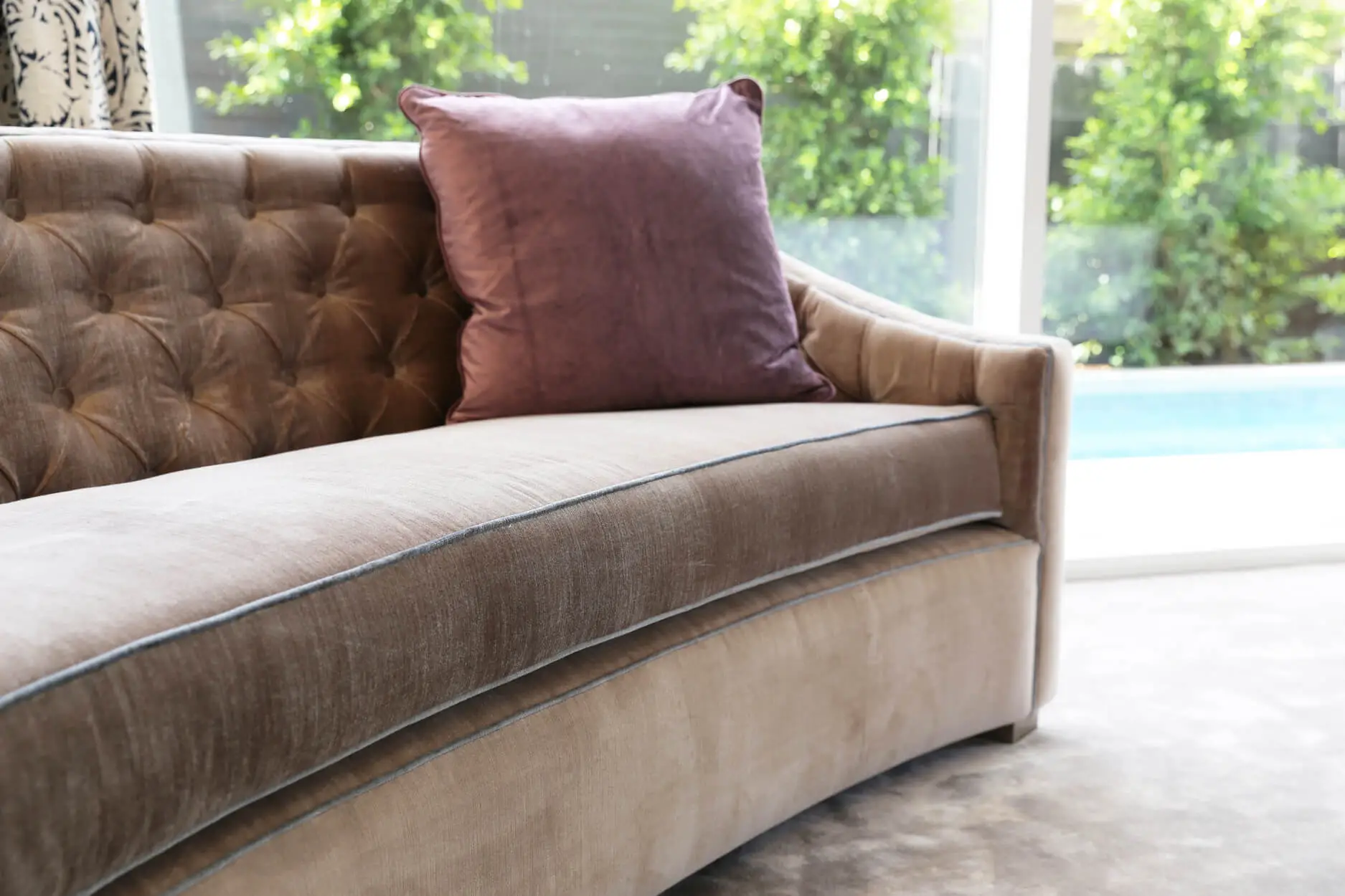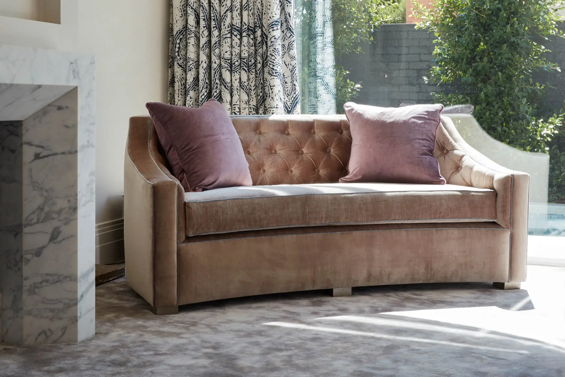 Custom designed and made Hamptons buttoned-back love seat. A contemporary finish in champagne velvet with contrast piping and buttoned backrest. Options of scatter cushions and coordinating room items are also available.