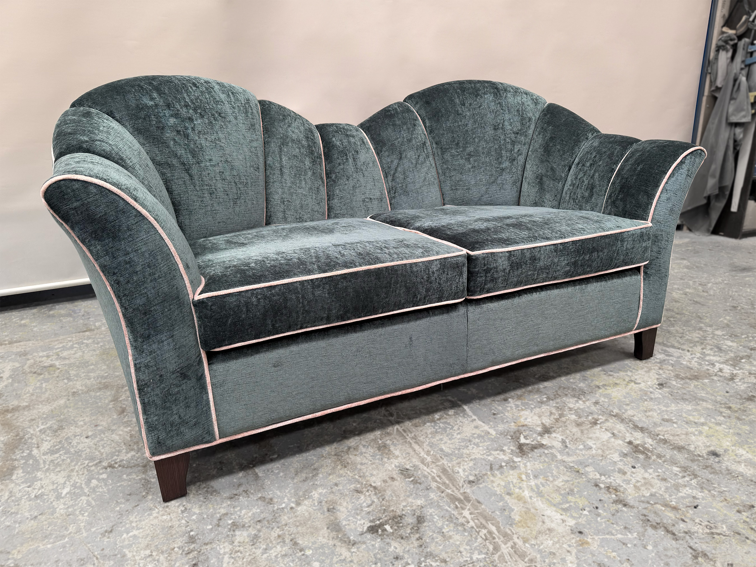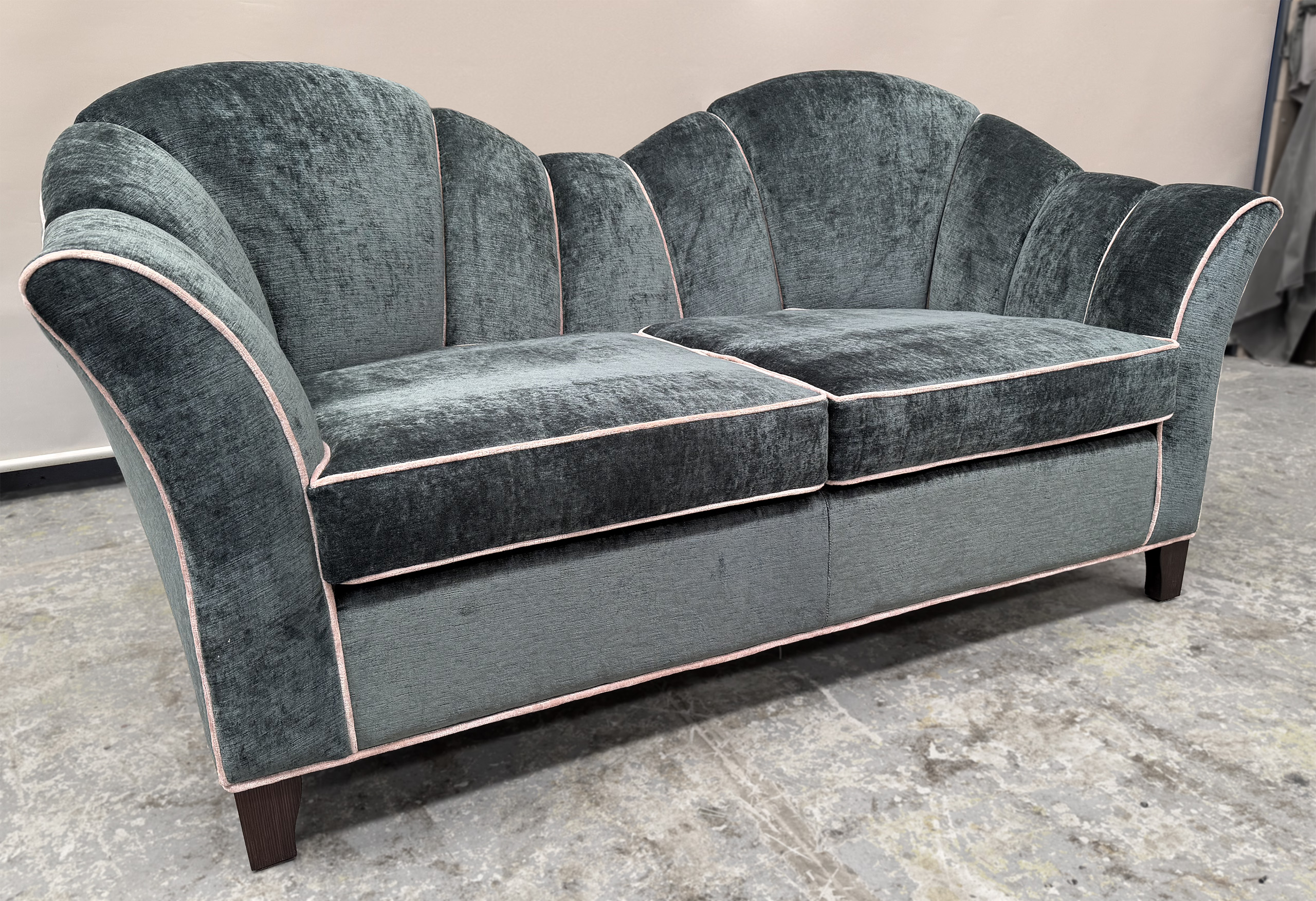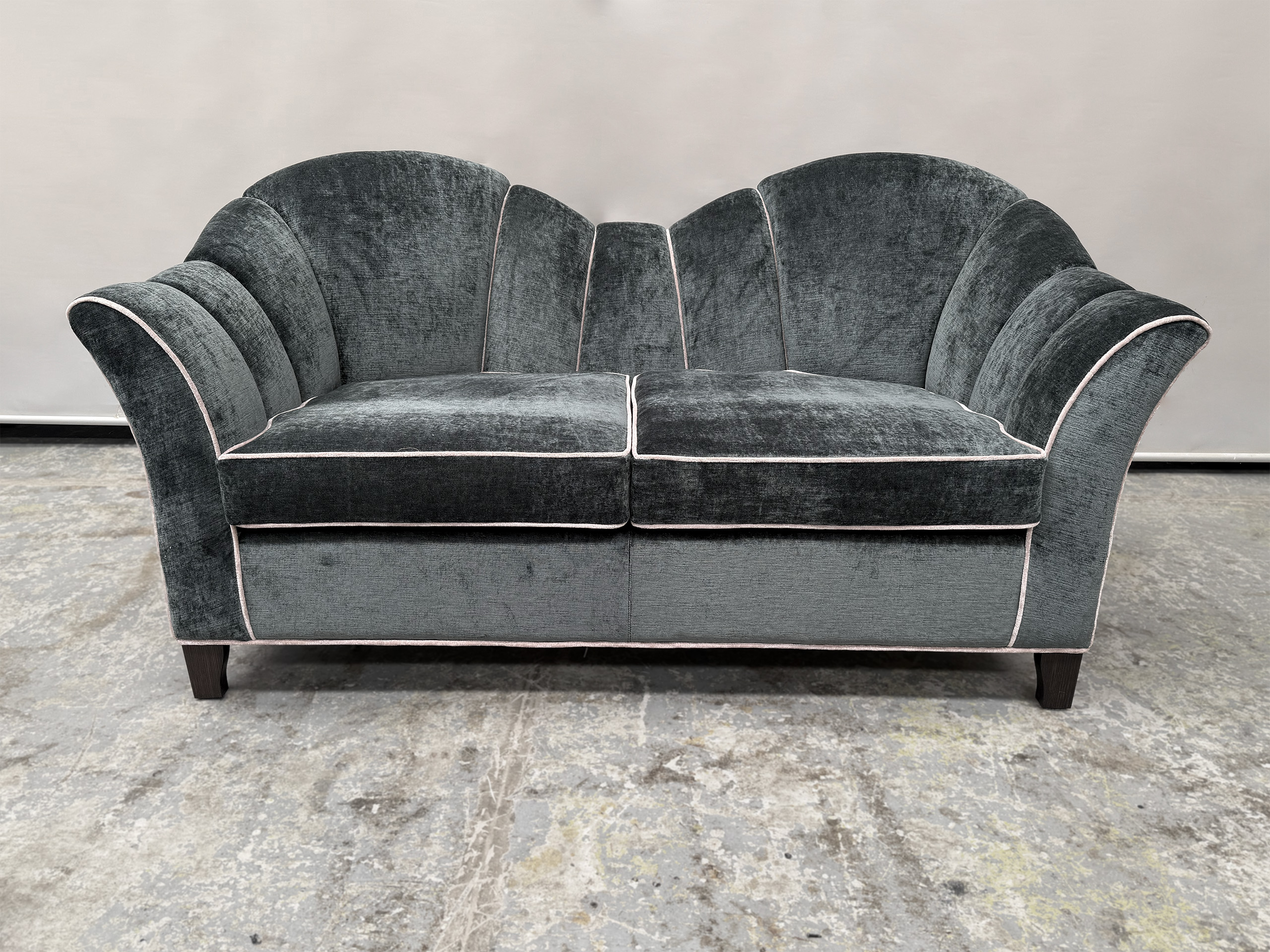 This custom made luxury Art Deco two seater sofa is crafted with precision and elegance, offering the perfect blend of comfort and timeless design. This Australian made piece features soft, flowing lines and a distinctive reverse camel-back silhouette, ideal for those seeking refined luxury furniture. The fluted backrest and smooth curves echo the sophistication of classic styles, while maintaining a contemporary edge. Reversible seat cushions provide added comfort and durability. Options of scatter cushions and coordinating room items are also available.