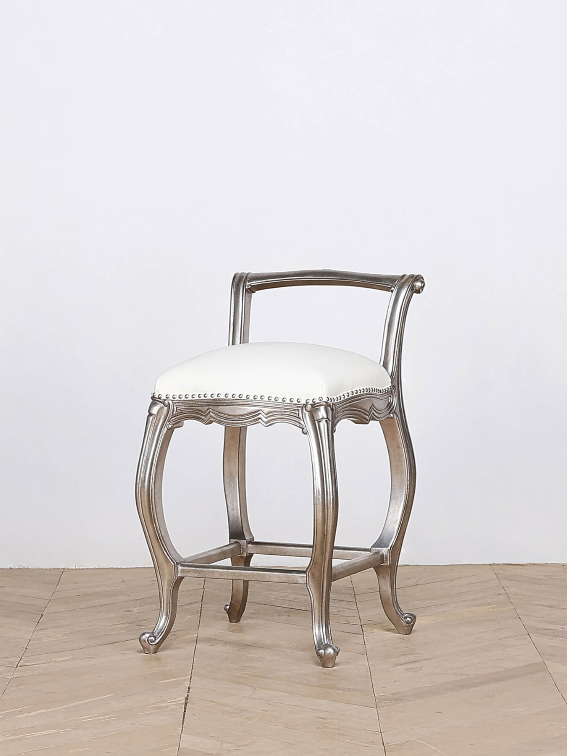 The luxury custom made French bar stool is bespoke, with white leather upholstery and a silver gilded frame, finished with silver stud detailing for a refined look. Handcrafted by luxury interior designer and furniture manufacturer Mark Alexander.