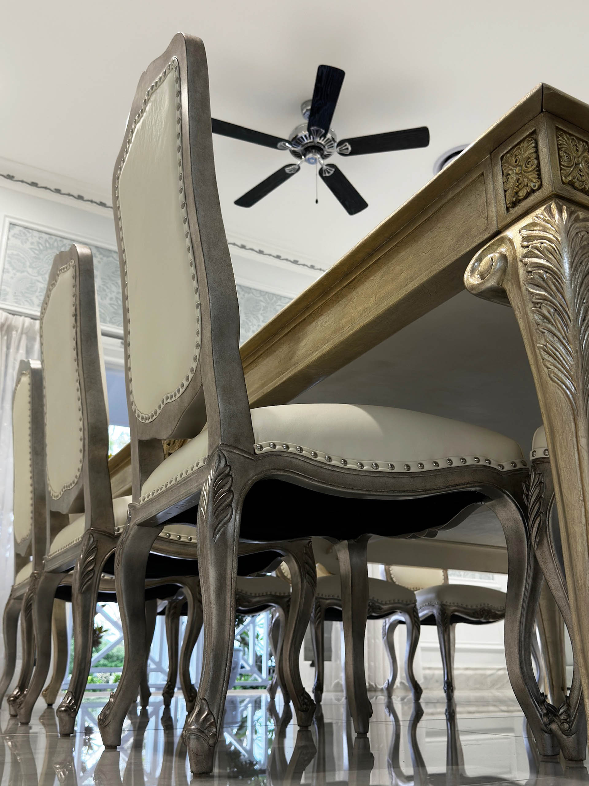 The luxury custom made French dining chair is bespoke, with white leather upholstery and a silver gilded finish, accented with silver studs for a refined and elegant touch. Handcrafted by luxury interior designer and furniture manufacturer Mark Alexander.