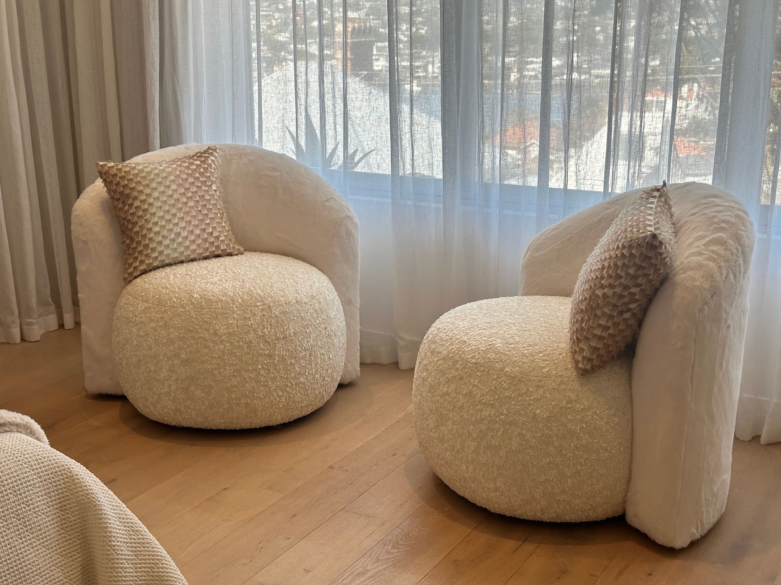 The Mid Century curved back armchair by luxury interior designer and furniture manufacturer Mark Alexander combines ergonomic comfort with timeless elegance. Crafted to complement a matching sofa design, this luxury furniture piece is Australian made furniture and fully custom made. Its solid wood internal frame is meticulously handcrafted, with frame, foam, and form seamlessly assembled to achieve smooth transitions, especially at the curved junctions between the backrest and armrests. The custom designed mirror-symmetrical profile adds balance and visual harmony to any refined interior.