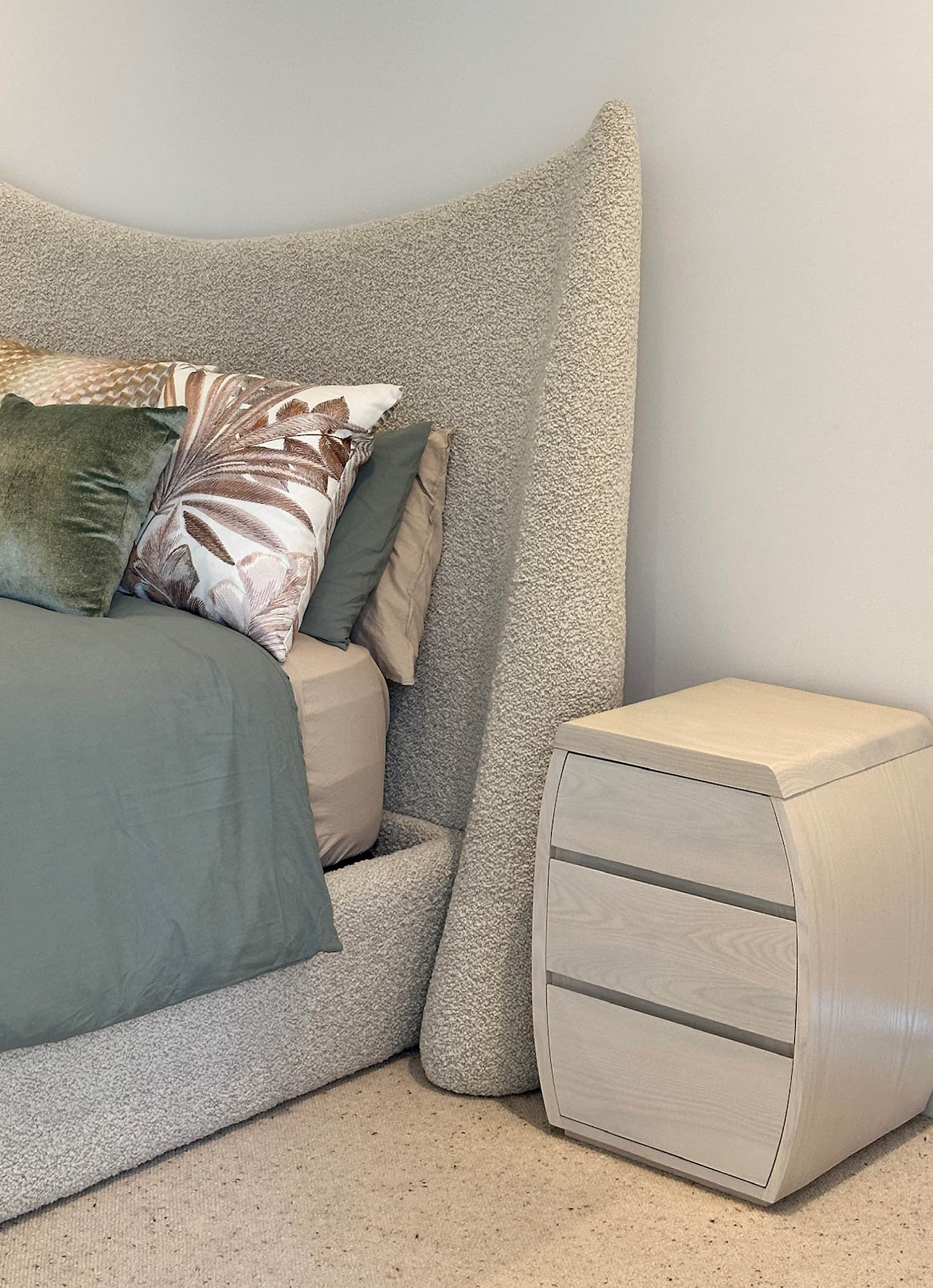 The Mid Century luxury sculptural bedside table is custom made from solid oak and oak veneer, featuring linear details on the drawer fronts with hidden hand pulls. The front showcases a contrasting bedhead-inspired design, handcrafted by luxury interior designer and furniture manufacturer Mark Alexander.