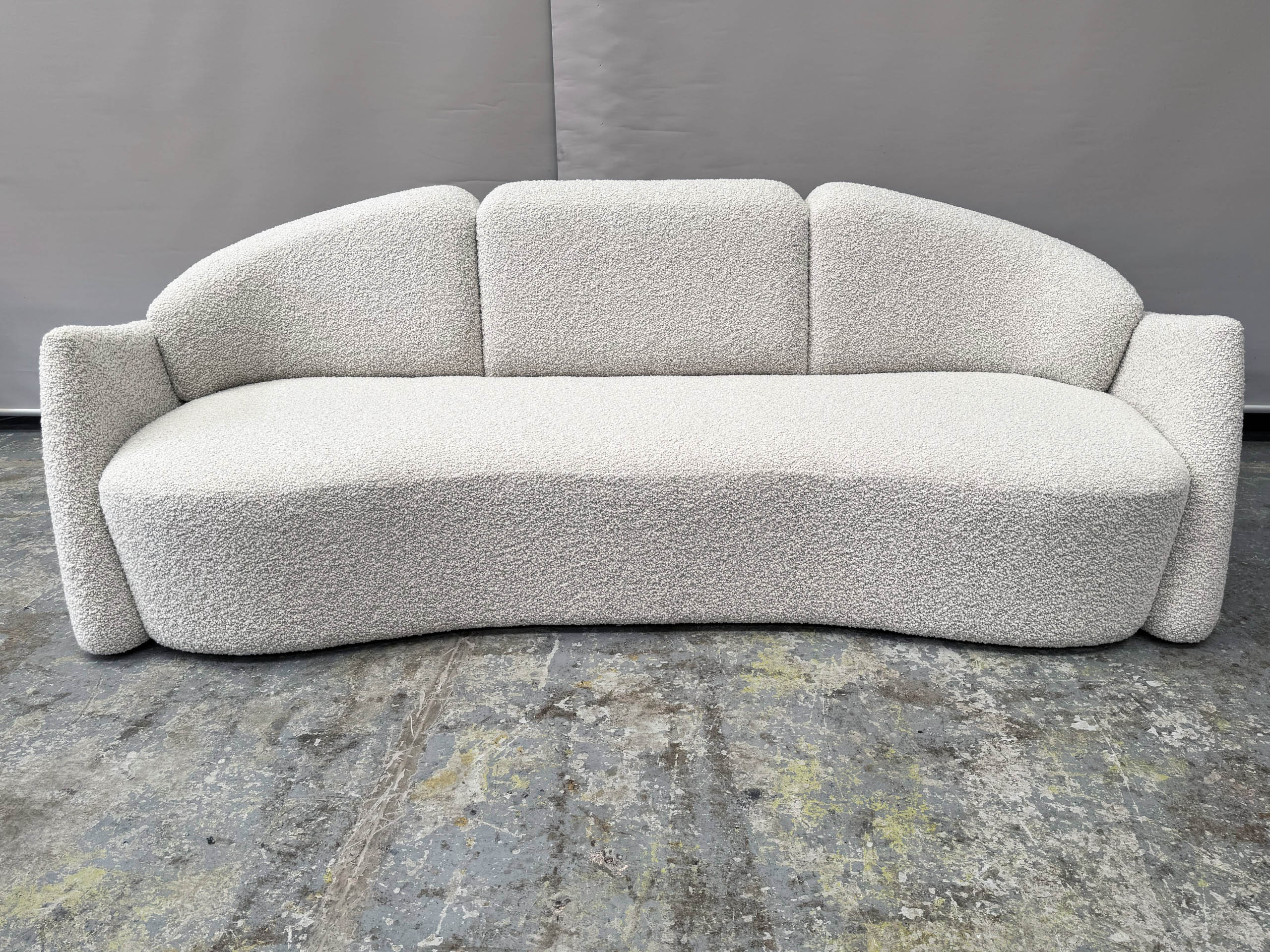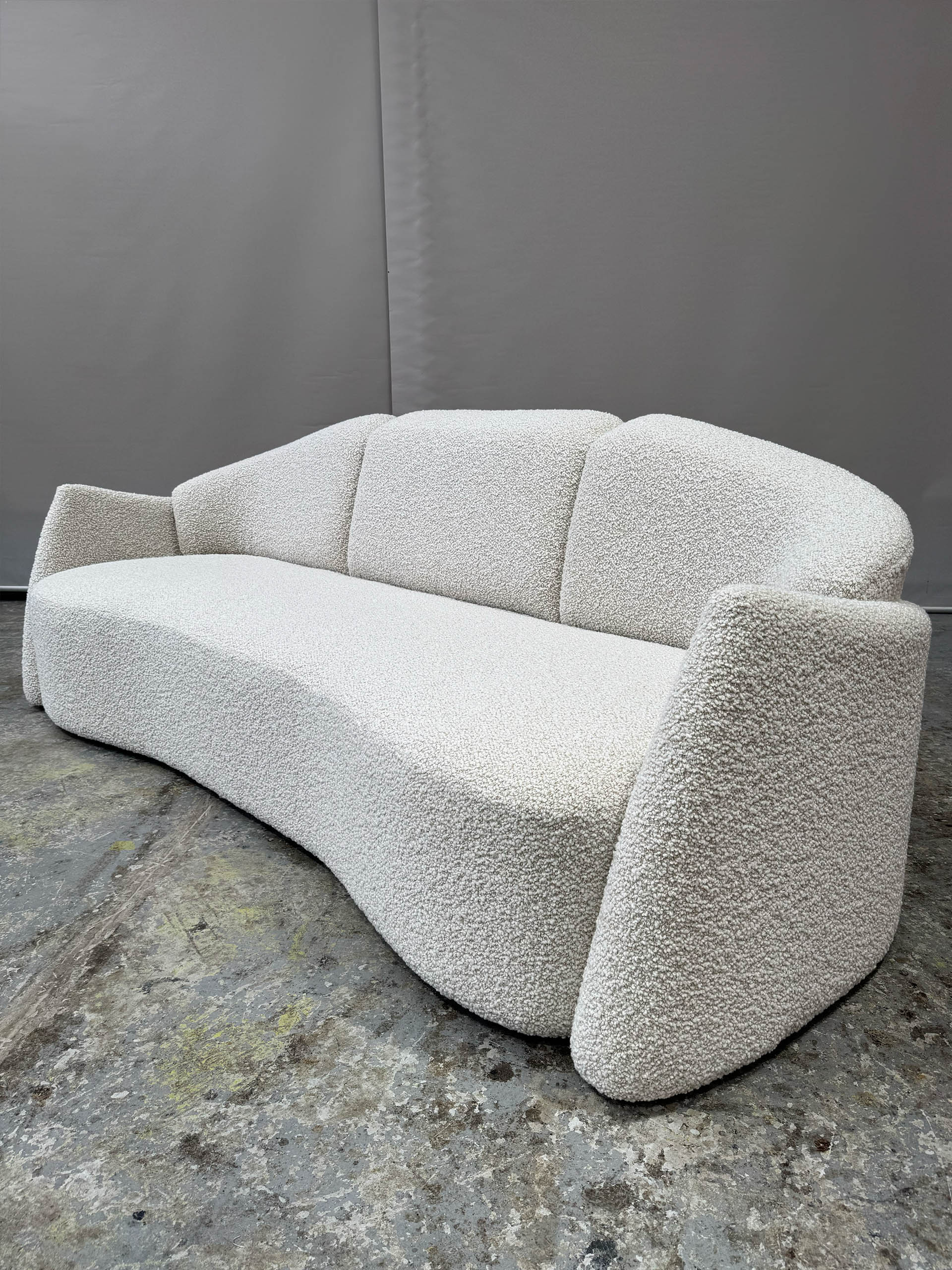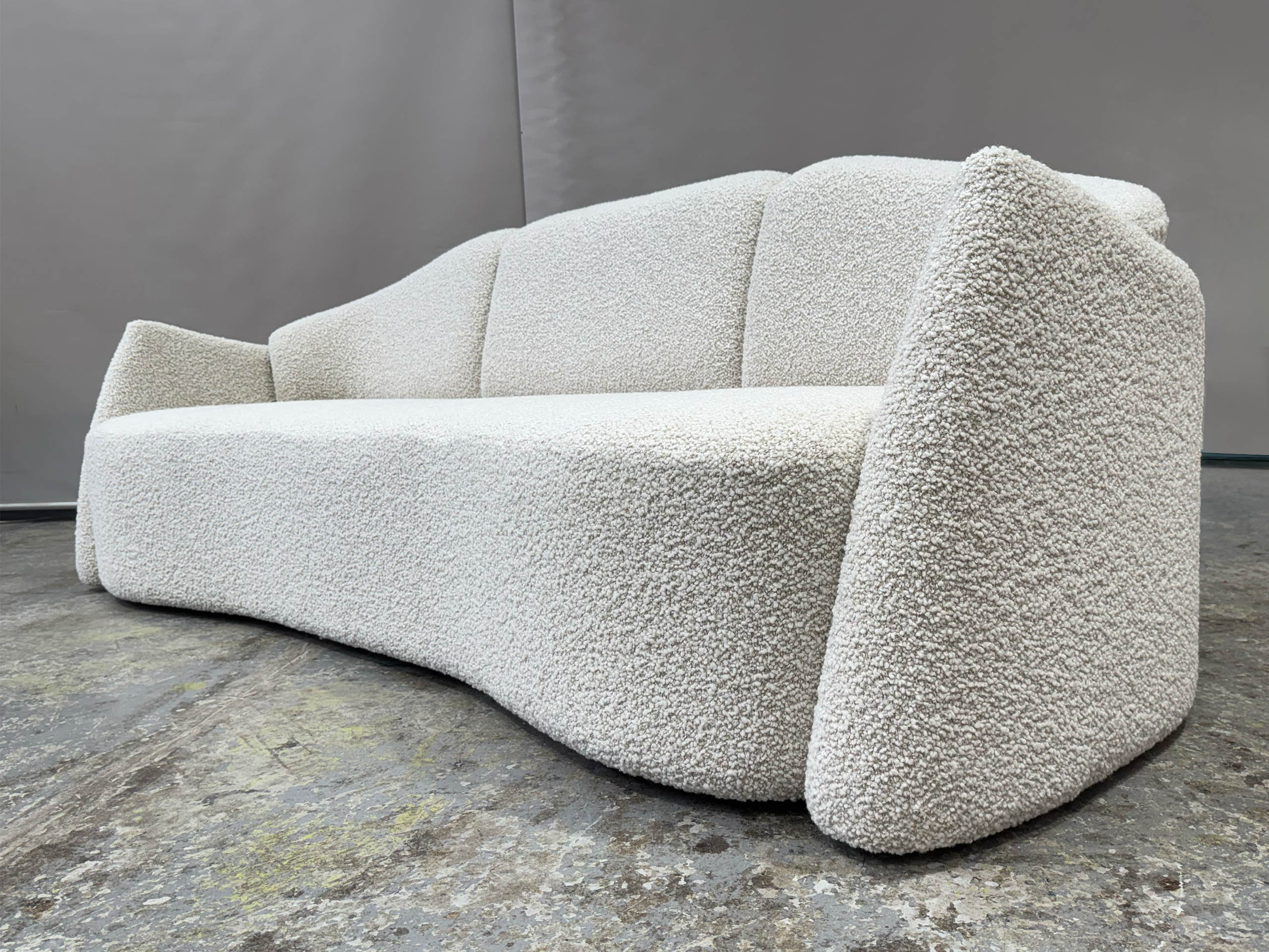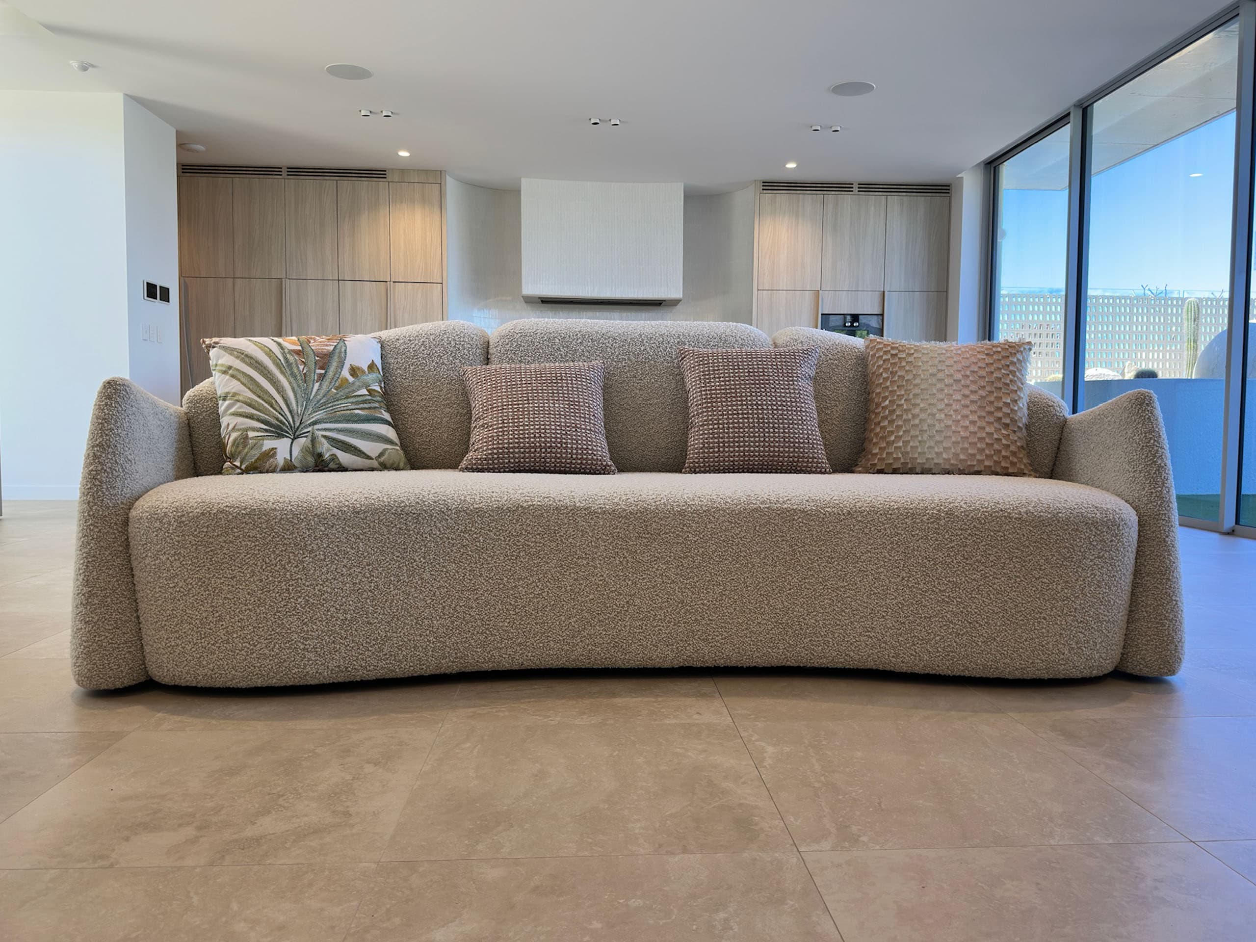 The Mid Century sculptural 3 seater curved sofa by luxury interior designer and furniture manufacturer Mark Alexander blends sculptural beauty with exceptional comfort. This luxury furniture piece is Australian made furniture and completely custom made, featuring a solid wood frame meticulously handcrafted for durability and elegance. The organic flowing silhouette, smooth transitions, and curved junctions between the backrest and armrests create a refined visual language. A split double backrest adds depth and support, while thick curved armrests provide comfort and a strong visual foundation. Custom designed for modern interiors, it serves as a striking centrepiece in any living space.