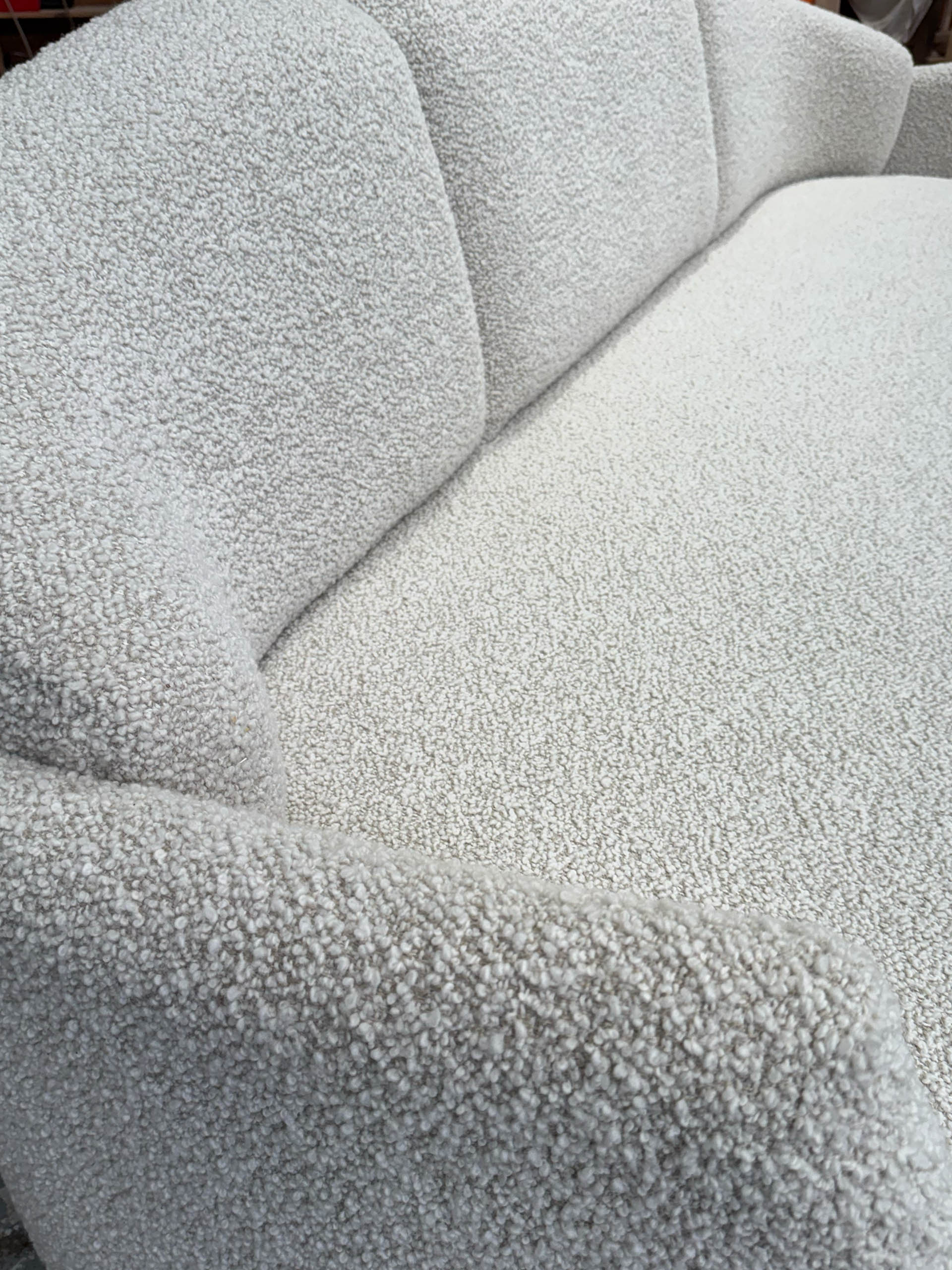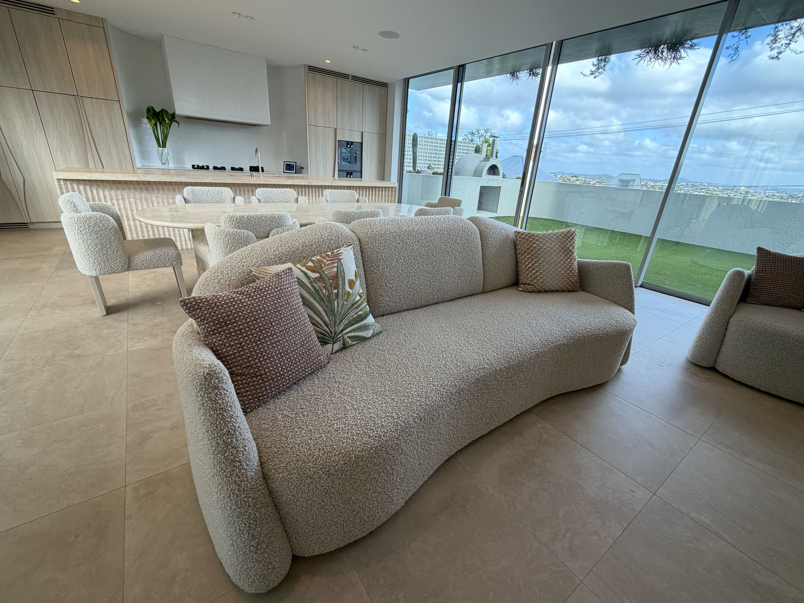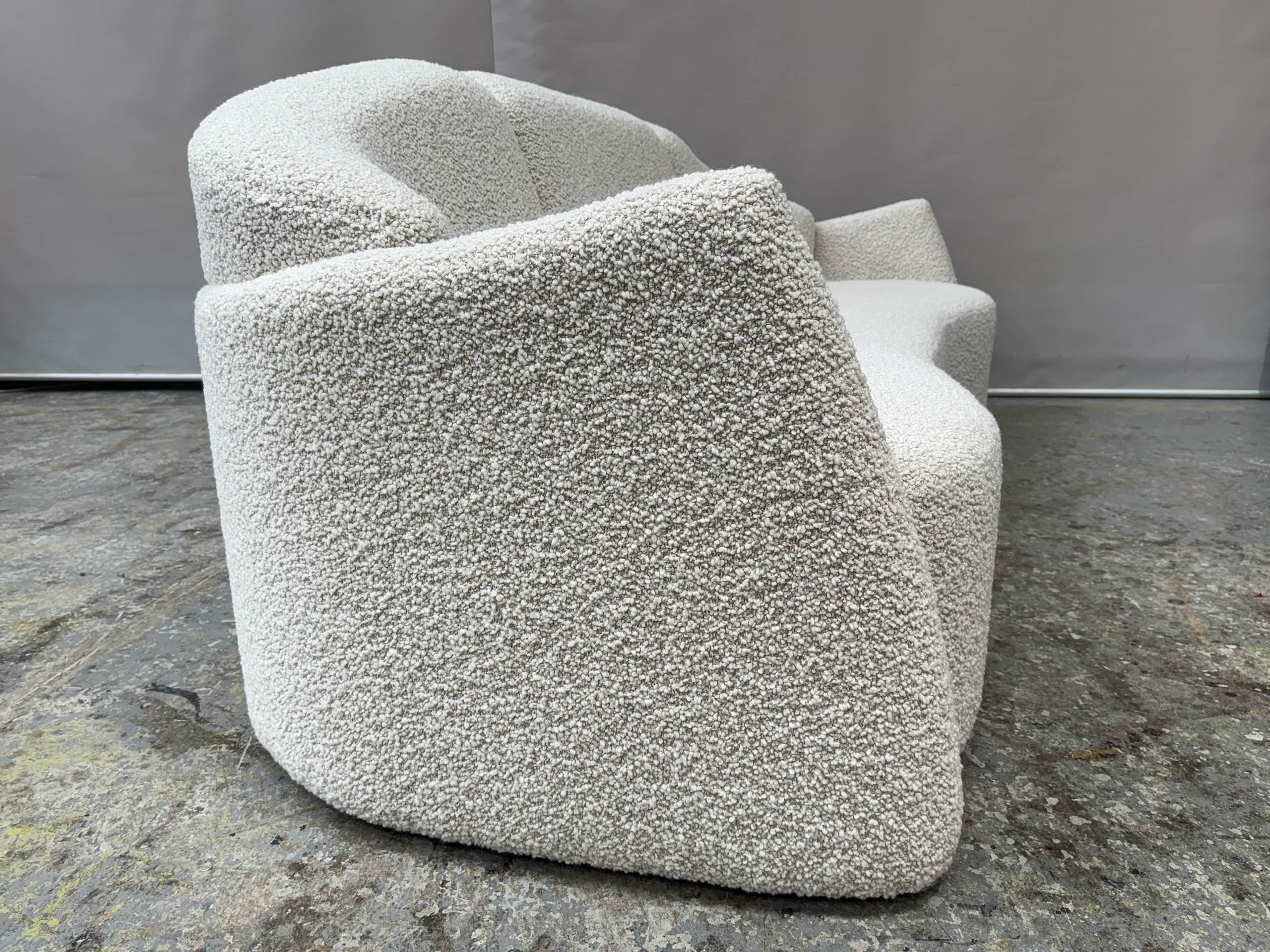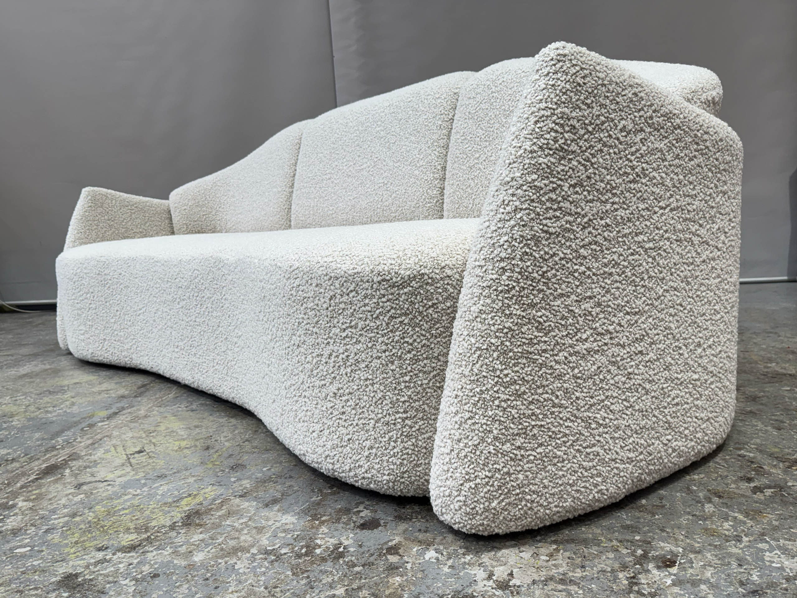 The Mid Century sculptural 3 seater curved sofa by luxury interior designer and furniture manufacturer Mark Alexander blends sculptural beauty with exceptional comfort. This luxury furniture piece is Australian made furniture and completely custom made, featuring a solid wood frame meticulously handcrafted for durability and elegance. The organic flowing silhouette, smooth transitions, and curved junctions between the backrest and armrests create a refined visual language. A split double backrest adds depth and support, while thick curved armrests provide comfort and a strong visual foundation. Custom designed for modern interiors, it serves as a striking centrepiece in any living space.