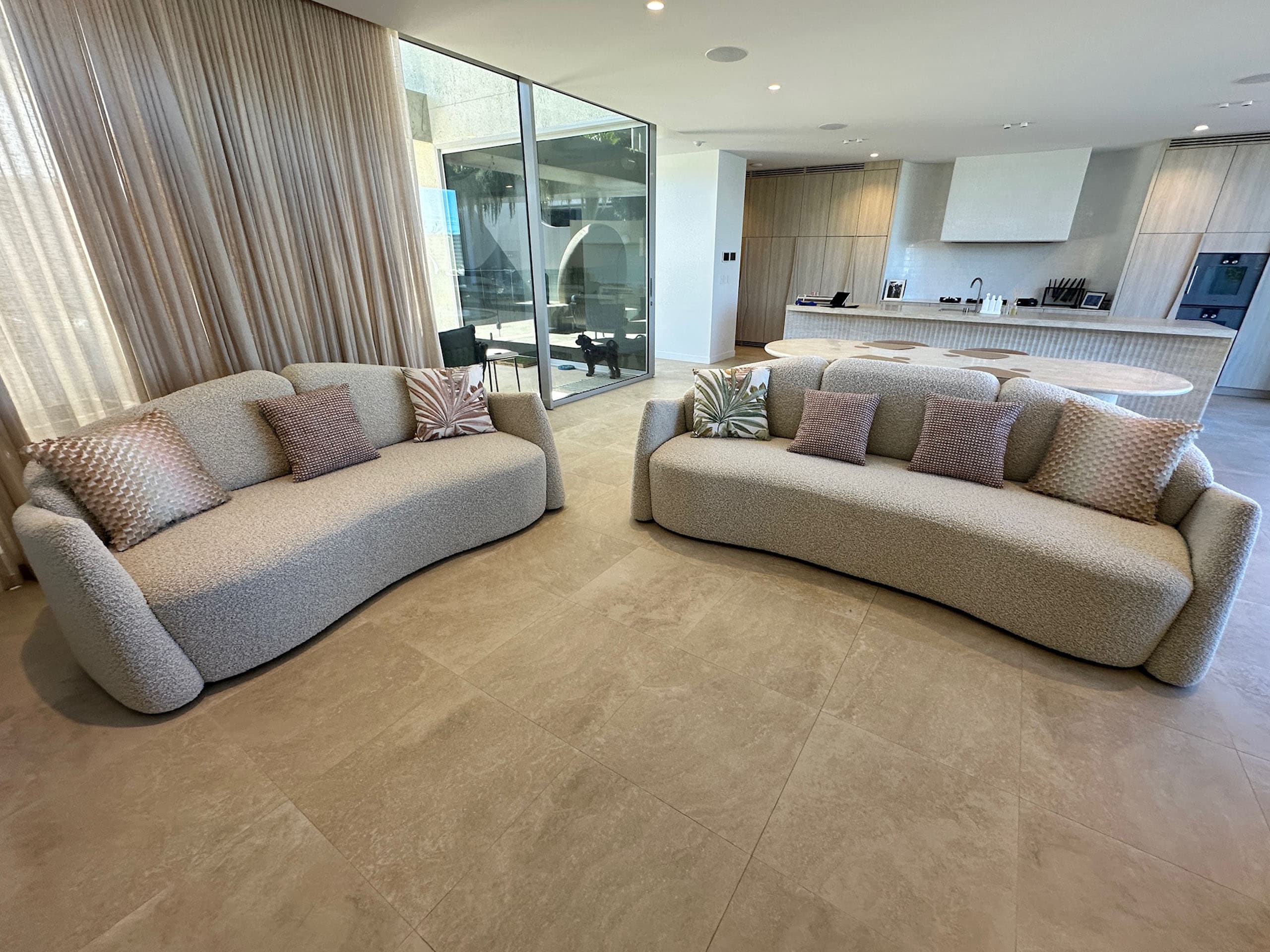 Each Australian made luxury curved sofa and modular sofa is custom designed to a premium standard of quality and finish. Dimensions, colour, and finish of our luxury furniture can all be custom made to your specific requirements, with a wide range of luxurious fabrics or leathers and frame colour options available.