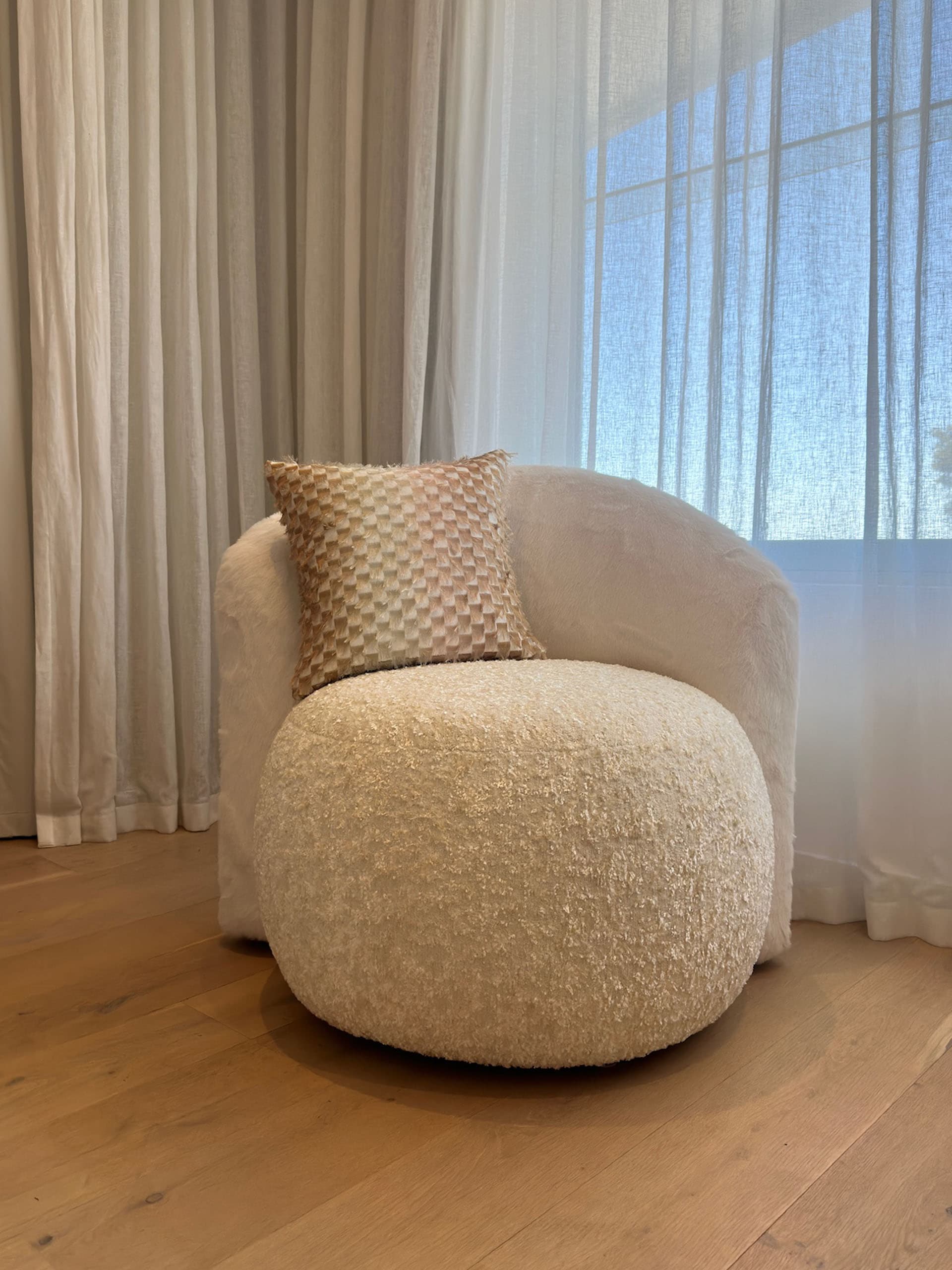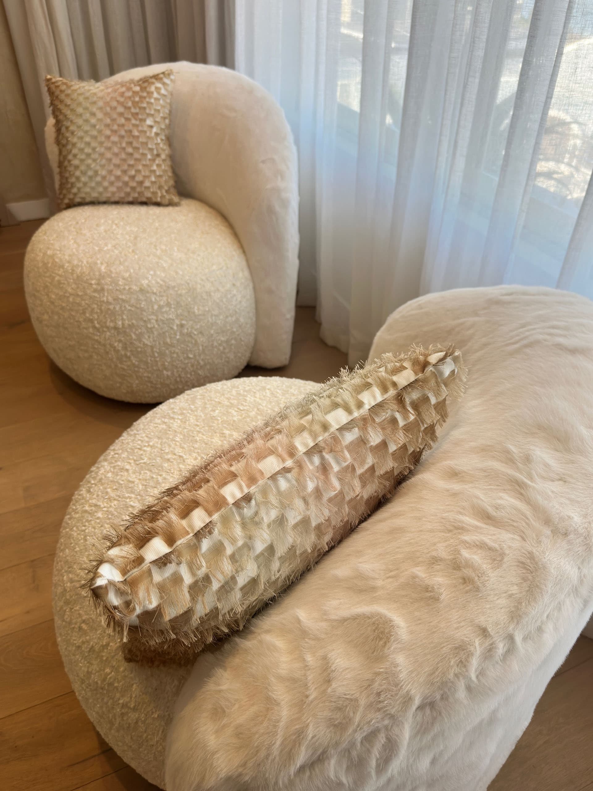 The modern curved back armchair by luxury interior designer and furniture manufacturer Mark Alexander combines ergonomic comfort with timeless elegance. Crafted to complement a matching sofa design, this luxury furniture piece is Australian made furniture and fully custom made. Its solid wood internal frame is meticulously handcrafted, with frame, foam, and form seamlessly assembled to achieve smooth transitions, especially at the curved junctions between the backrest and armrests. The custom designed mirror-symmetrical profile adds balance and visual harmony to any refined interior.