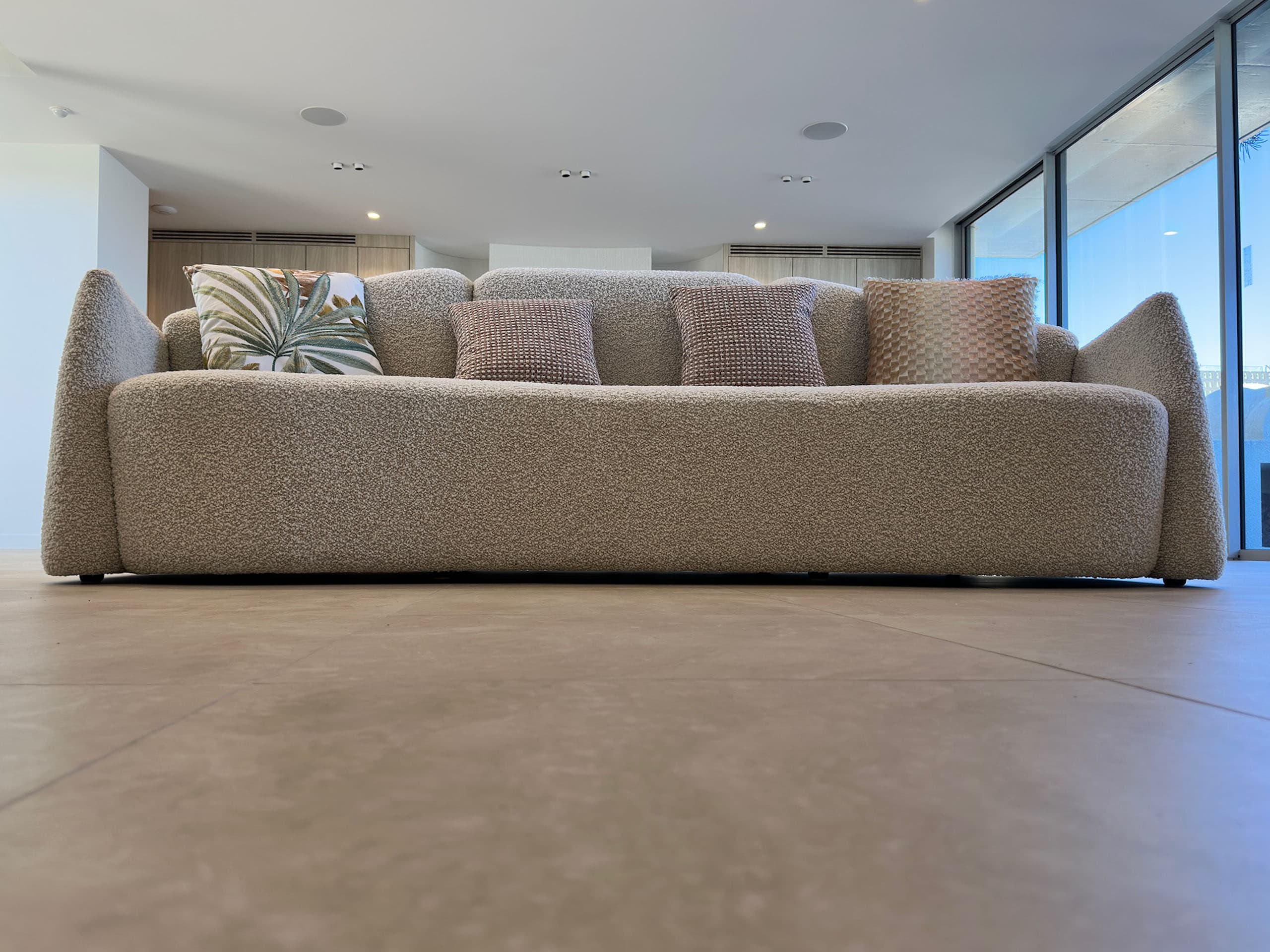 The modern sculptural 3 seater curved sofa by luxury interior designer and furniture manufacturer Mark Alexander blends sculptural beauty with exceptional comfort. This luxury furniture piece is Australian made furniture and completely custom made, featuring a solid wood frame meticulously handcrafted for durability and elegance. The organic flowing silhouette, smooth transitions, and curved junctions between the backrest and armrests create a refined visual language. A split double backrest adds depth and support, while thick curved armrests provide comfort and a strong visual foundation. Custom designed for modern interiors, it serves as a striking centrepiece in any living space.